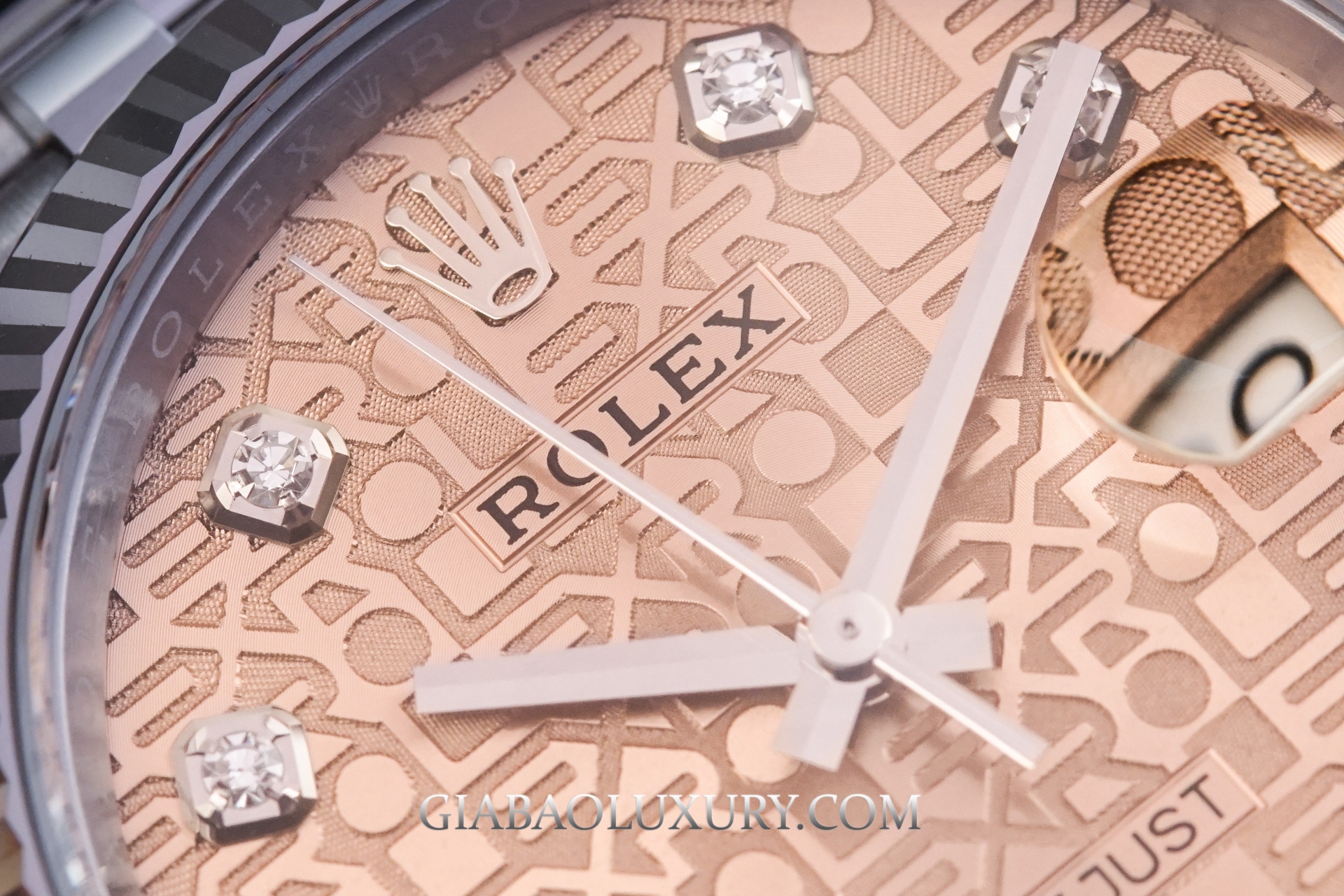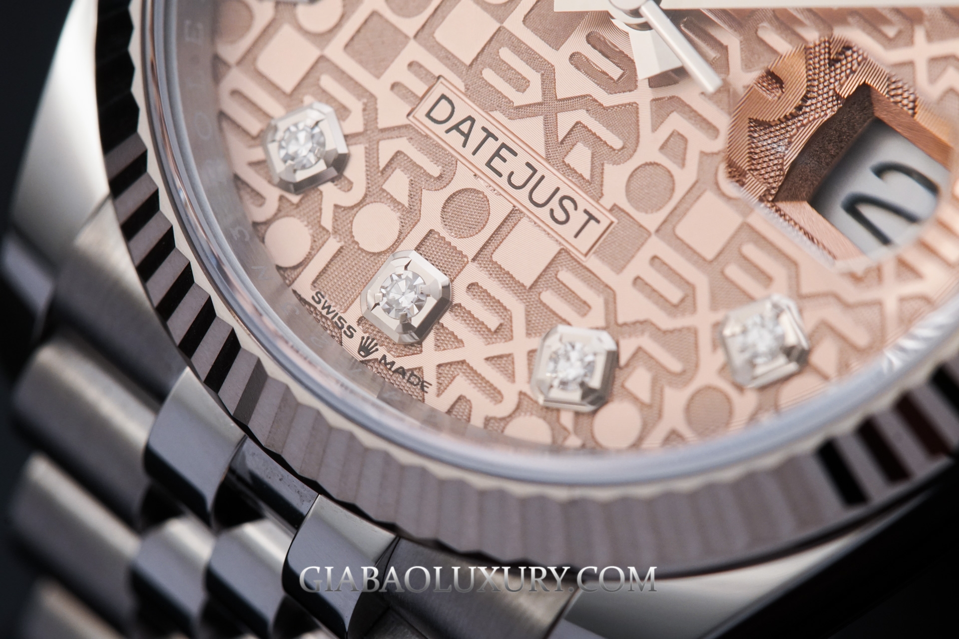 Trên nền mặt số vi tính cá hồi là những chi tiết tạo nên cái tên Datejust đã được sử dụng hơn 65 năm. Dòng đồng hồ Datejust nguyên bản được biết đến với ba kim đơn gian, hệ thống cọc giờ đính nổi và tất nhiên phải có đi kèm duy nhất ô cửa sổ báo ngày trên góc 3 giờ. Những chi tiết ấy vẫn được giữ lại, nhưng được gia tăng giá trị với việc sử dụng các chất liệu cao cấp hơn.