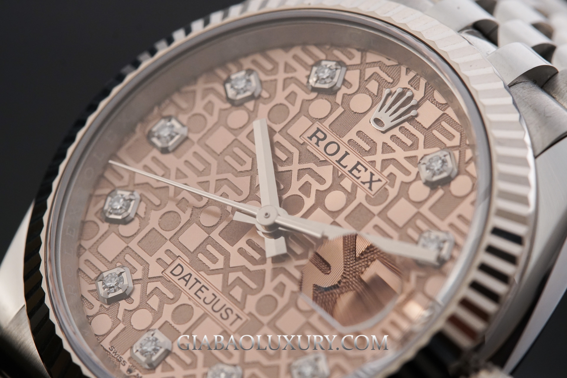 Tại Việt Nam, nhiều người gọi mặt số dạng này là mặt số vi tính, còn theo ngôn ngữ quốc tế đó là “Jubilee design”. Chúng ta có thể tạm thời bỏ qua tên gọi đây là dạng mặt số gì, và đến phần cảm nhận cá nhân. Tôi yêu thích mặt số cá hồi trơn, chỉ nên để lại cách hoành thiện chải tia quen thuộc trên nhiều chiếc đồng hồ bởi màu cá hồi đã rất tuyệt vời và nổi bật. Sự xuất hiện của các chữ cái bên trên đem đến một cái hiện đại hơn, có chiều sâu hơn cho cả chiếc Rolex Datejust 126234 song đồng thời với điều đó là sự cổ điển cũng bị thuyên giảm.