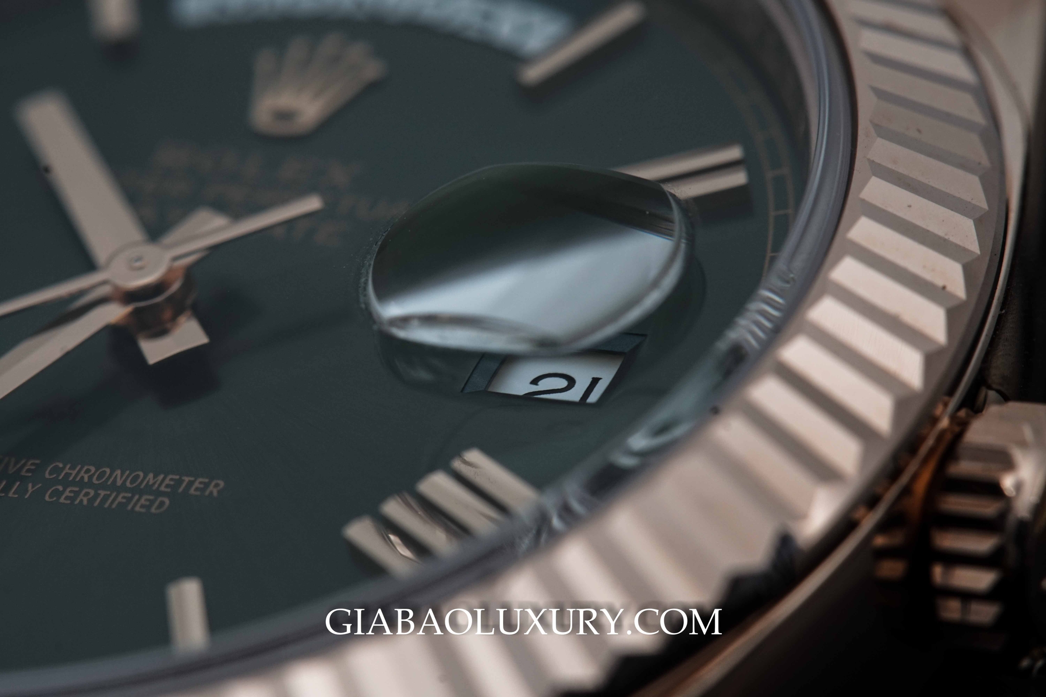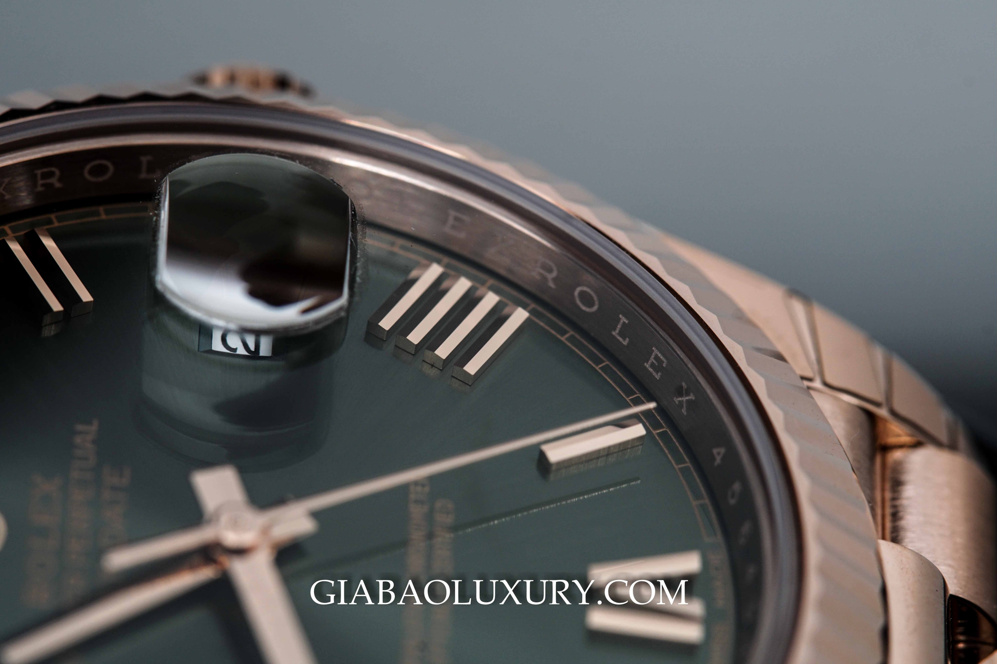 Mặt số đồng hồ được xem là “gương mặt đại diện” của chiếc đồng hồ. Nhưng Rolex đã sáng tạo nên một điều vô cùng mới lạ, và tôi dám cá với quý vị rằng điều thú vị này chỉ duy nhất xuất hiện trên thiết kế Day-Date kỉ niệm 60 năm này. Rolex Oyster Perpetual Day-Date 228235 sở hữu một mặt số xanh lá tuyệt đẹp. Màu sắc kì diệu ấy được chế tác tinh xảo trên nền mặt số, đánh bóng tạo vân sunray đầy cuốn hút. Chúng ta ngay lập tức có thể nhận thấy rằng, rất hiếm có chiếc đồng hồ nào được hoàn thiện với mặt số xanh lá, mà màu sắc lại vô cùng đặc biệt như Rolex Oyster Perpetual Day-Date 228235, nên cá nhân tôi đánh giá đây là sự táo bạo và phá cách độc đáo nhất của Rolex trong thiết kế kỉ niệm này.