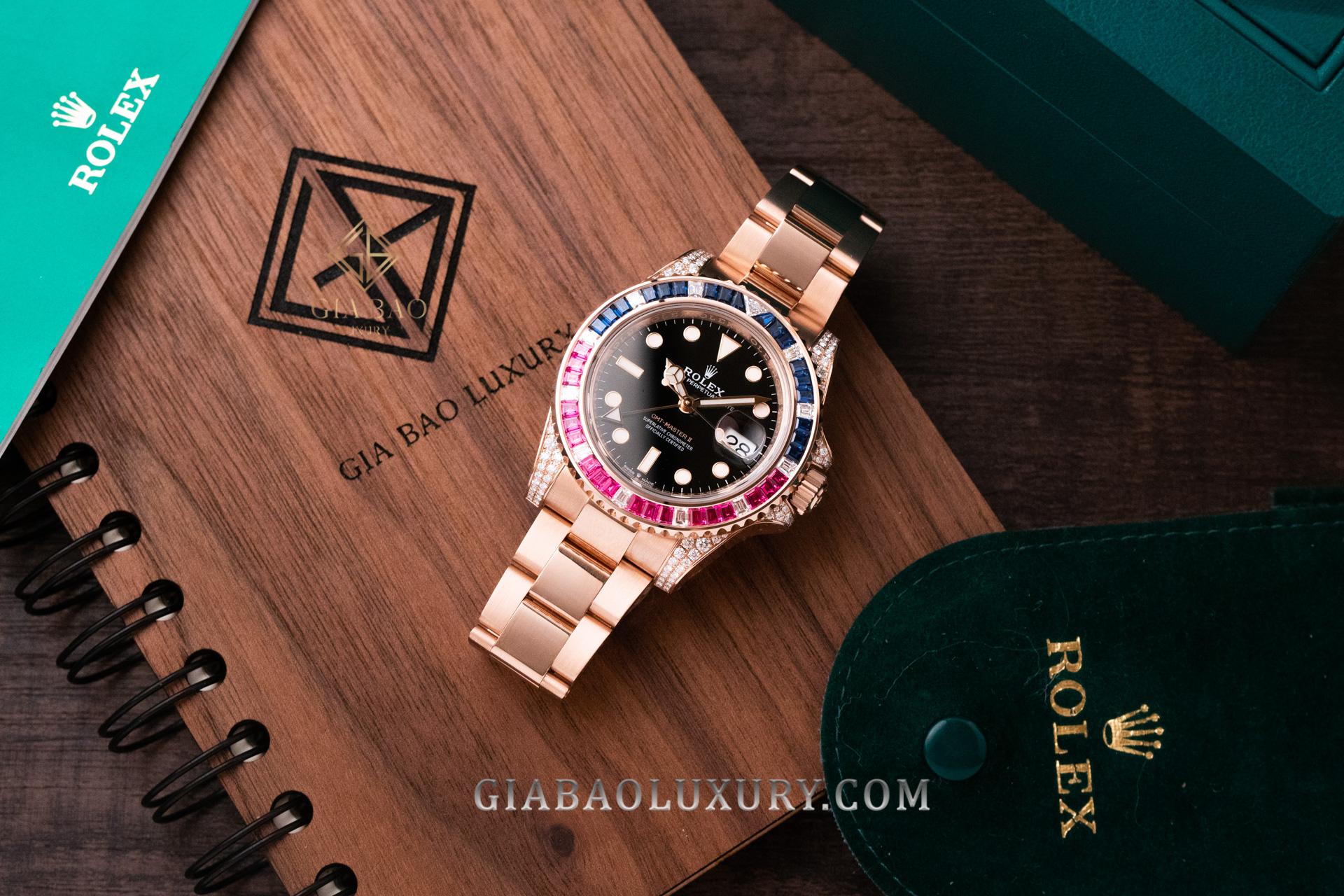 Quay trở lại với chiếc 126755 SARU ra mắt tại Baselworld 2019, đây là lần đầu tiên bộ vành Sapphire – Ruby được sử dụng trên chất liệu vàng Everose độc quyền của Rolex. Chúng ta vẫn có những thiết kế quen thuộc đã làm nên tên tuổi của dòng GMT-Master, nhưng được nâng lên một đẳng cấp mới.