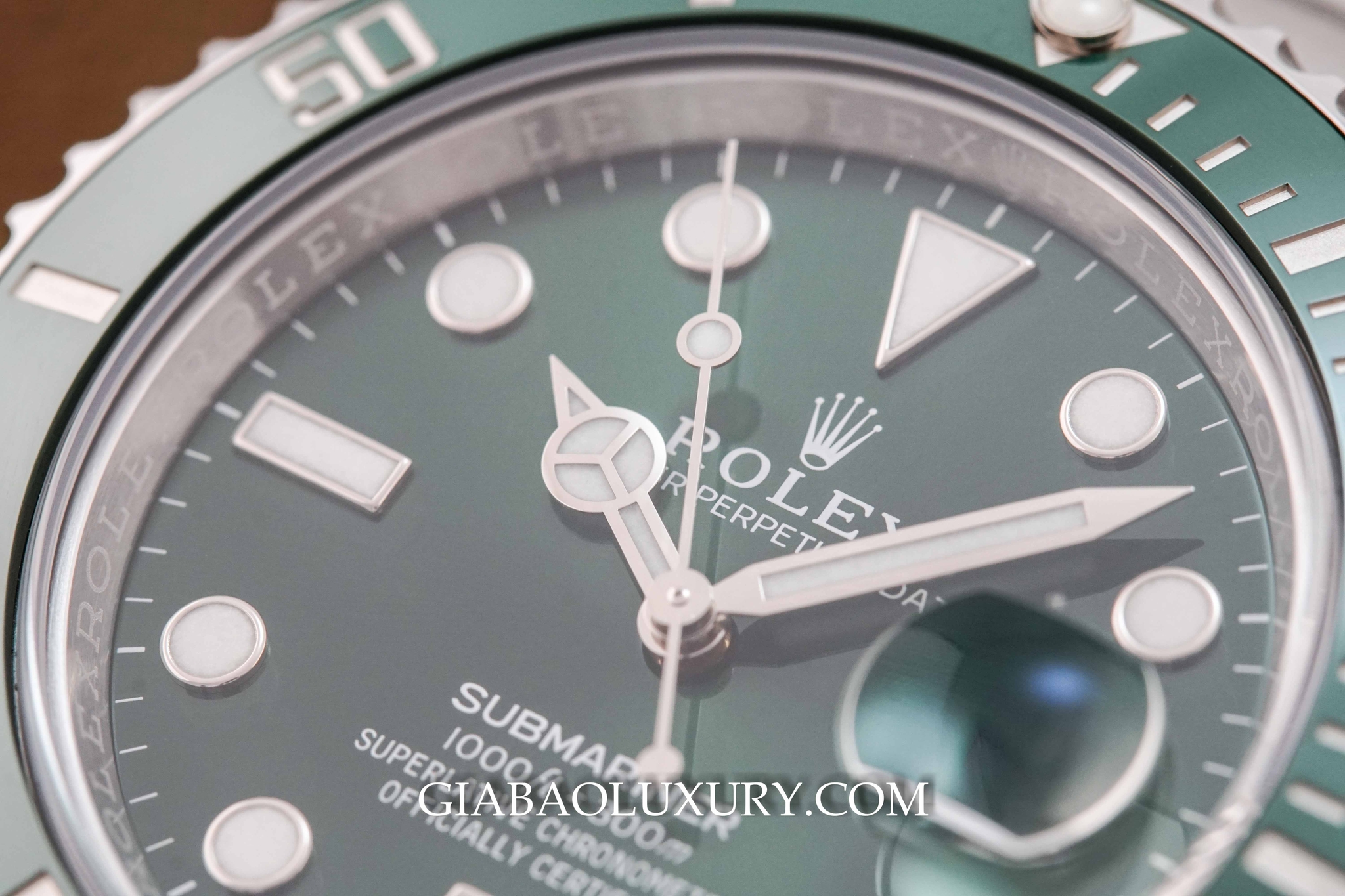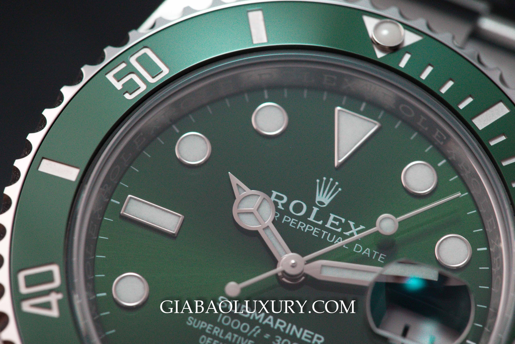 Đầu tiên, chiếc đồng hồ sở hữu mặt số xanh lá cây sẫm ton-sur-ton với vành Bezel của đồng hồ. Màu xanh lá cây cũng chính là lý do vì sao chiếc đồng hồ còn được biết đến với cái tên “Hulk", người khổng lồ xanh.