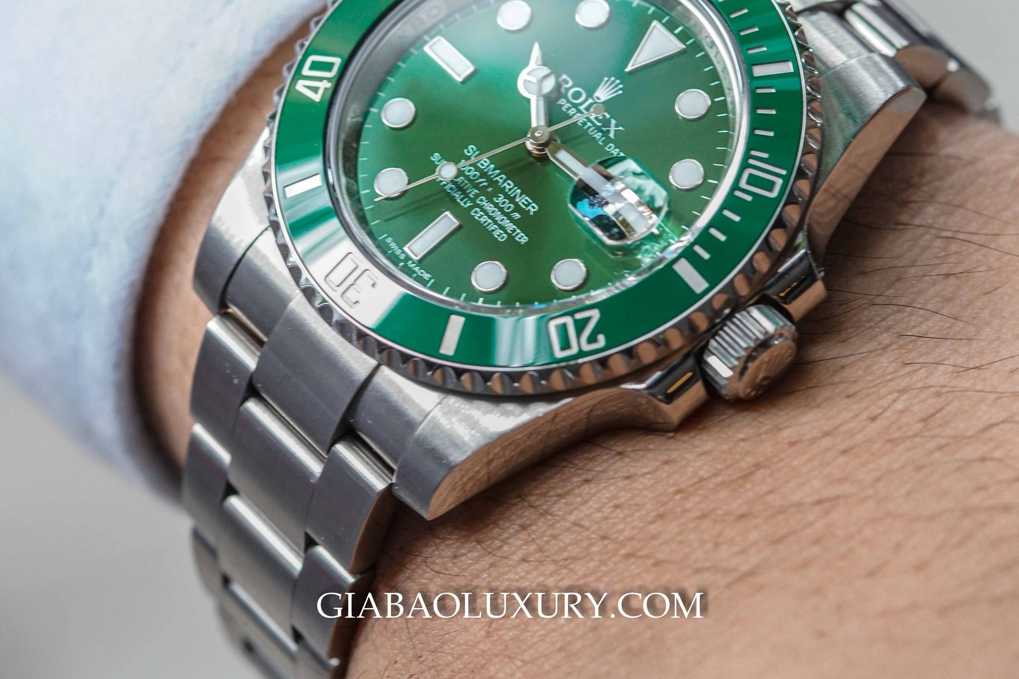 Màu xanh của Submariner Hulk là xanh lá cây sẫm, cực kỳ khoẻ khoắn và thanh lịch. Theo ý kiến cá nhân, có lẽ Hulk sẽ tuyệt nhất khi được đi cùng một bộ vest đen và một đôi giày da lịch lãm.