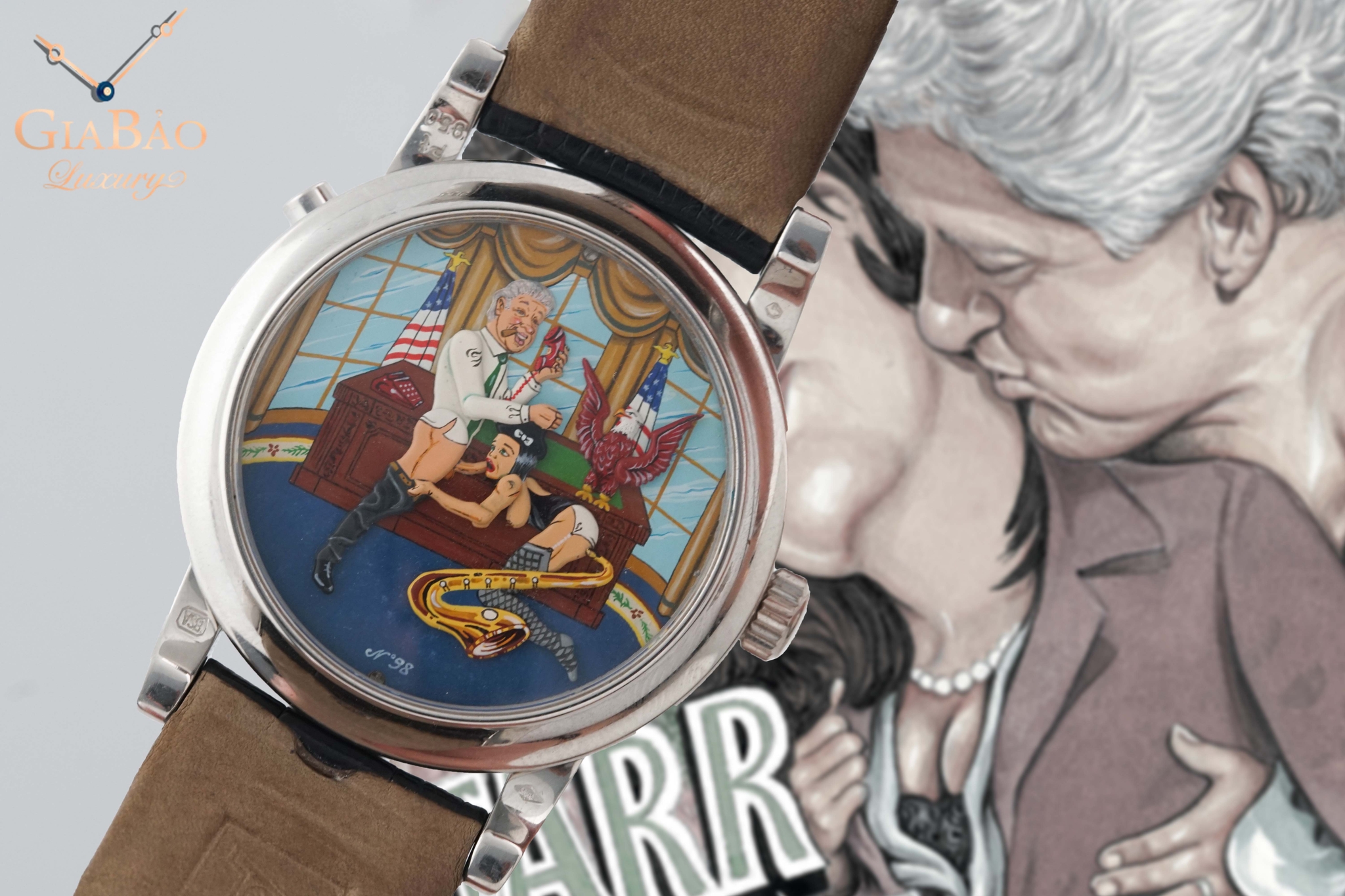 Có thể mặt số đồng hồ có chút đặc biệt, nhưng thứ hấp dẫn nhất lại nằm ở mặt sau đồng hồ. Như bạn có thể thấy ở trên, mặt sau của chiếc đồng hồ là một khung cảnh không thực sự hợp với "thuần phong mỹ tục" người Việt (Còn hợp "thuần phong mỹ tục" ở Mỹ hay không thì tôi không rõ): Ngài Bill Clinton đang được "chăm sóc cực kỳ đặc biệt" bởi một người phụ nữ.