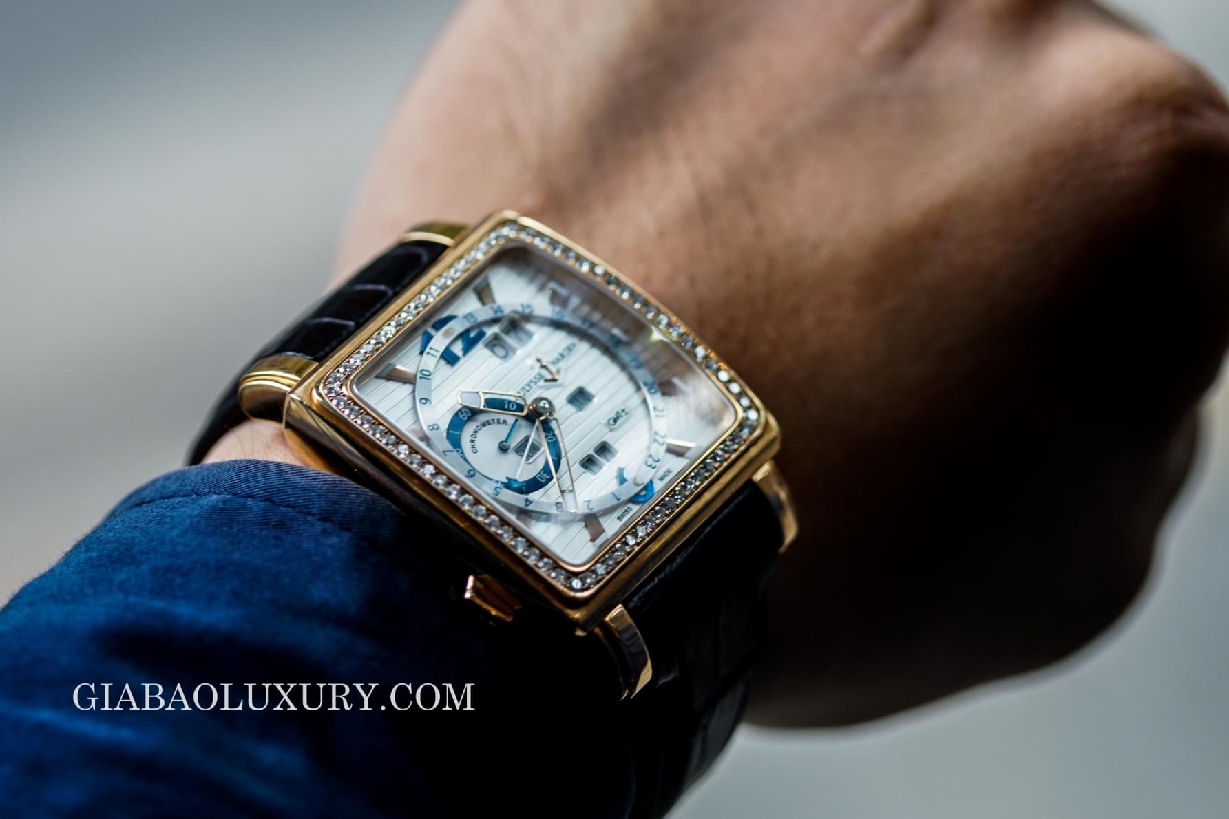 Mẫu đồng hồ Ulysse Nardin Quadrato Dual Time Perpetual cũng được mang trong mình một chút cảm hứng từ chiếc vô-lăng lái tàu. Mặt số đồng hồ với vòng bezel đúc từ vàng hồng nguyên khối cùng họa tiết “vòng tròn không xoay” và tia chỉ giờ chính là tay nắm của chiếc vô-lăng đó. Vòng dây da ôm sát cổ tay càng tăng thêm tính chất mạnh mẽ, phong cách cho người sử dụng khi đeo chiếc đồng hồ này.