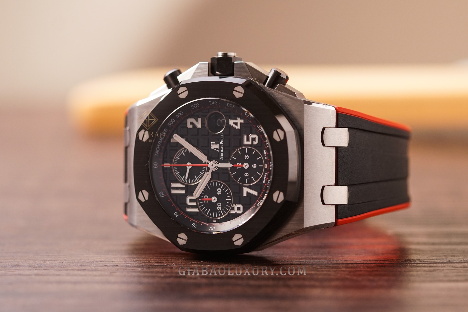 Royal Oak Offshore lại một lần nữa làm mọi người kinh ngạc về kích thước “quá khổ” (vẫn là vào thời điểm đó) với đường kính 42mm, một gioăng cao su nổi bật phía sau vành bezel bát giác, bộ dây cao su và phần núm chỉnh giờ cùng nút bấm Chronograph được bọc cao su. Lại một lần nữa, thiết kế của Audemars Piguet bị chê tơi tả khi ra mắt, thậm chí là từ Gerald Genta.