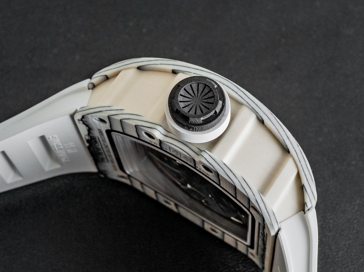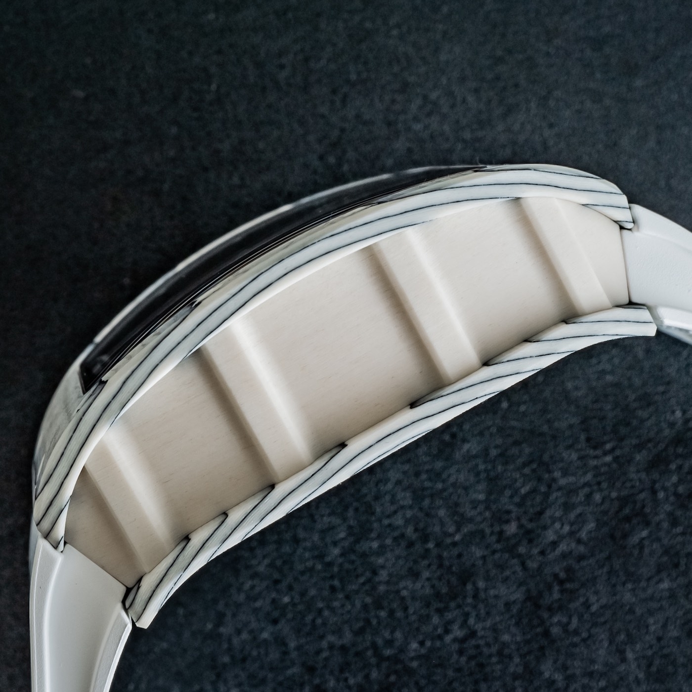 Bộ vỏ trắng này được làm từ chất liệu Quartz TPT (Thin Ply Technology), đây là một phát minh của công ty North Thin Ply Technologies - đối tác của Richard Mille. Quartz TPT là một vật liệu siêu nhẹ, siêu bền được tạo ra từ nhiều lớp sợi thạch anh mỏng, chuyên được sử dụng trong ngành hàng không, du thuyền hay các môn thể thao tốc độ.