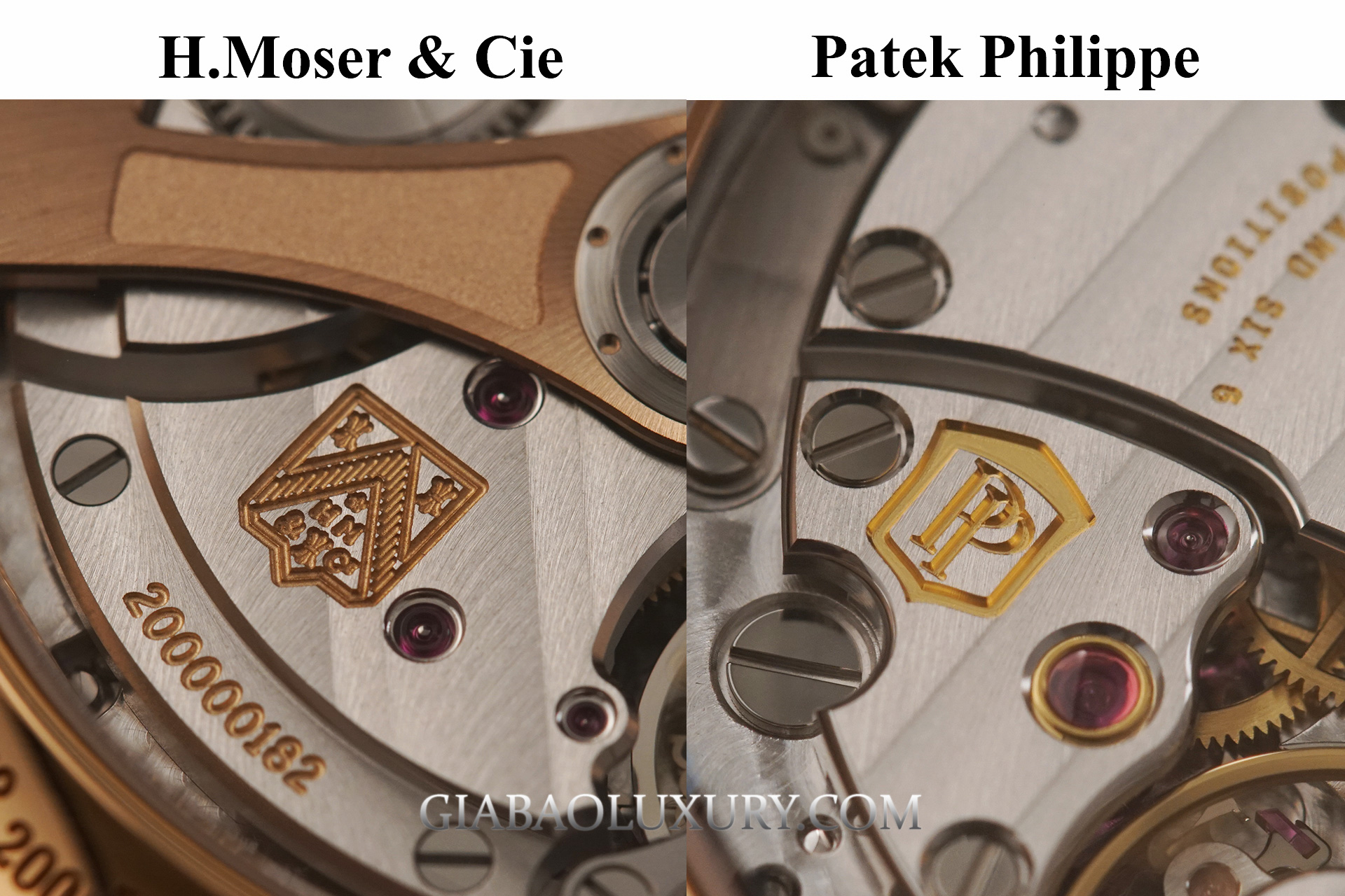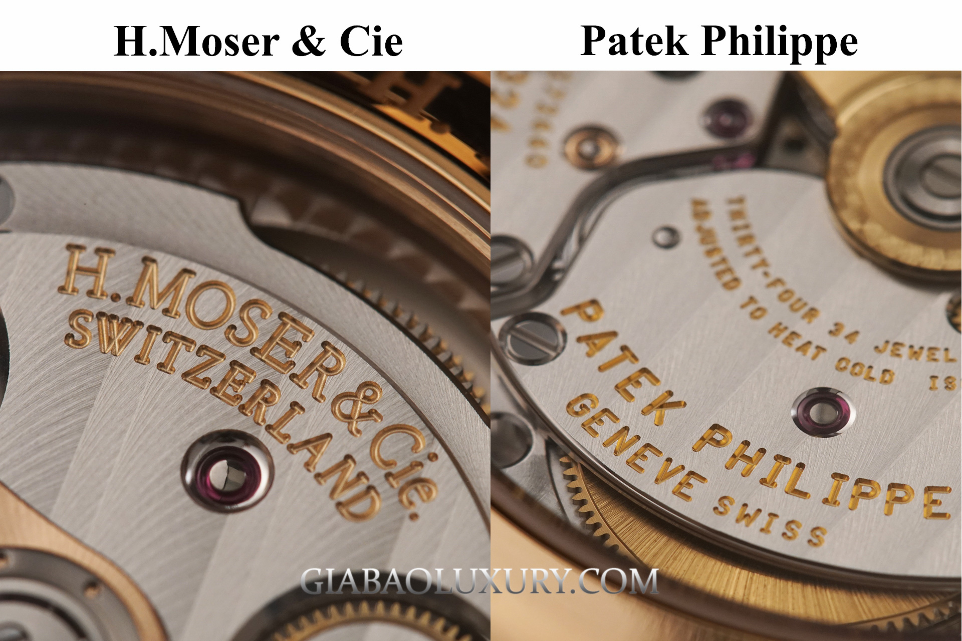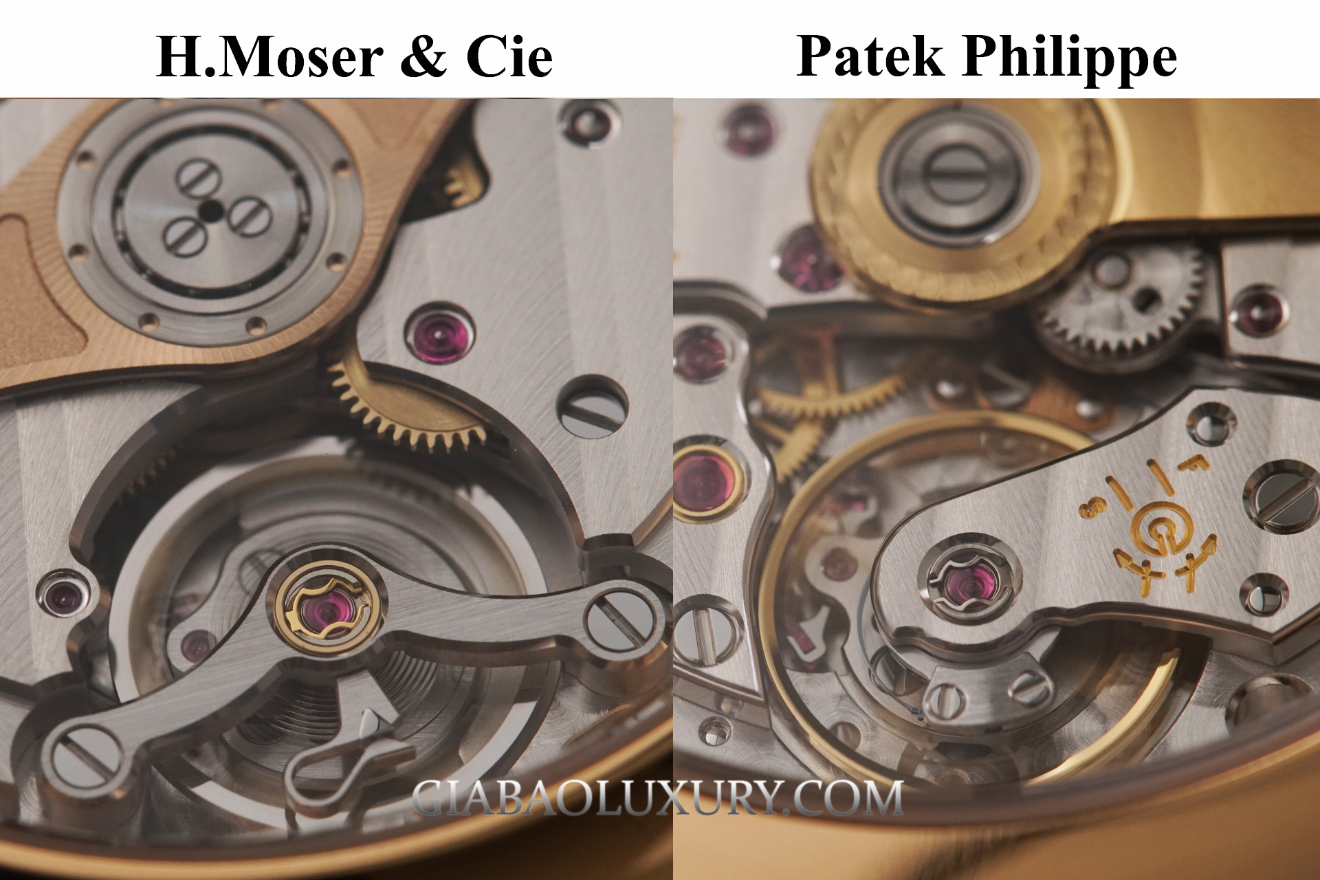 Tiếp đến, chúng ta sẽ xét tới bộ máy đồng hồ. Cả hai bộ máy đều có độ hoàn thiện cao, với những đường vân sọc, chải xước, vát cạnh đầy đủ. Nếu xét về ngoại hình, bộ máy của H. Moser trông sẽ đặc biệt hơn một chút với cầu nối được trang trí bởi những đường vân sọc đôi đặc trưng của thương hiệu.