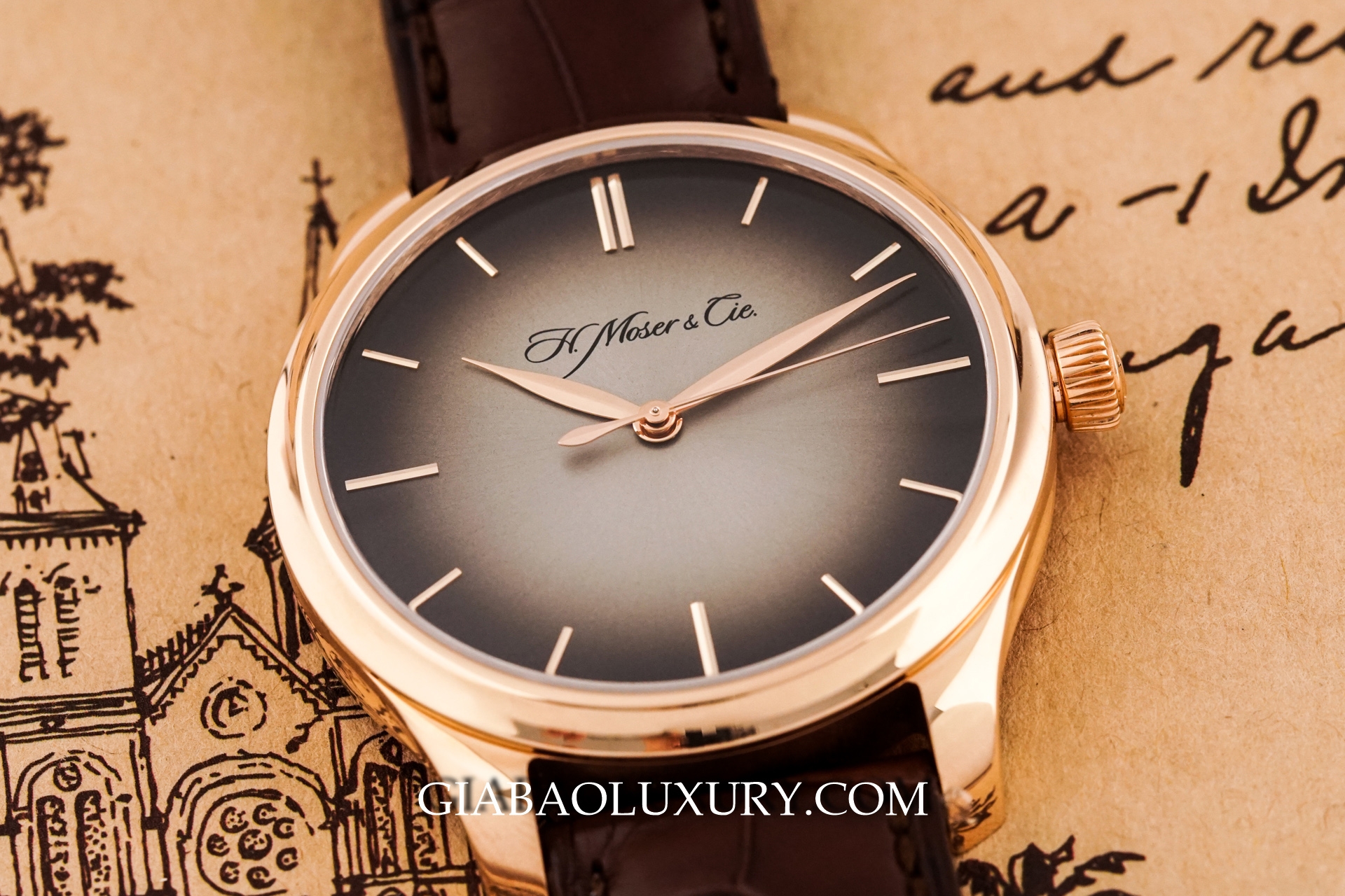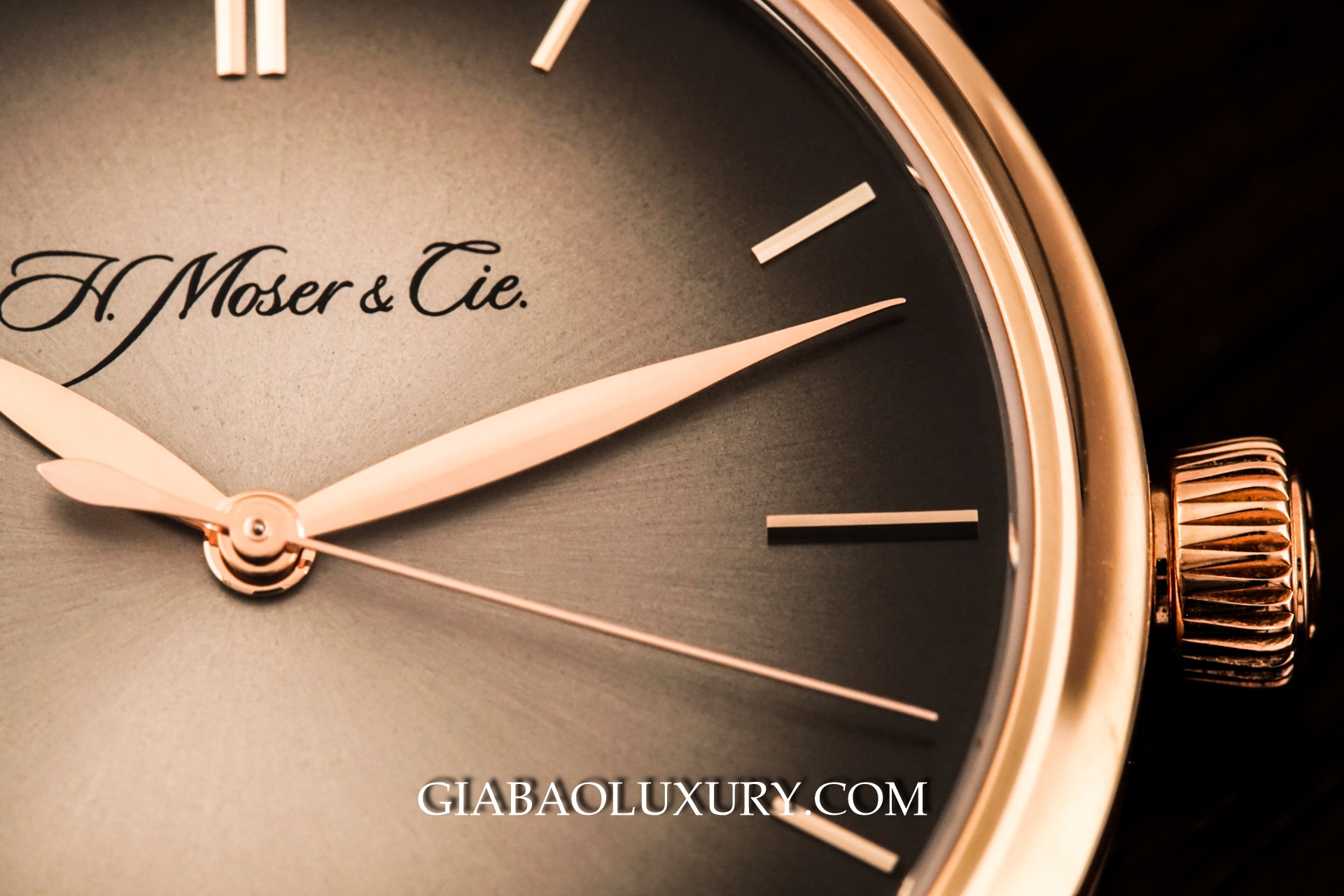 Nếu nhìn vào phần nền mặt số, tạm bỏ qua những chi tiết như cọc số hay kim que, H. Moser thậm chí còn có phần nổi trội hơn Patek Philippe với mặt xám khói ấn tượng. Việc thực hiện mặt số này phải mất cả ngày trời, cần tới hơn 400 lớp sơn lên từng phần của mặt số, nhằm đảo bảo việc chuyển sắc tự nhiên nhất từ màu xám sang màu đen. Bạn cứ thử tưởng tượng công việc một cách đơn giản như sau: sơn 1 lớp, đợi lớp sơn đó khô, lại sơn thêm một lớp nữa, lại đợi khô,...