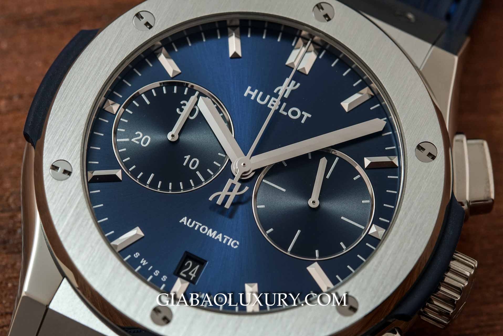 Còn với chiếc Hublot Classic Fusion 45mm, mặt số hiện lên có phần trang nhã, và nhiều khoảng trống hơn. Hai mặt số phụ cân xứng nhau nằm tại góc 3 giờ và 9 giờ. Chỉ còn một mặt số phụ đếm phút phục vụ tính năng chronograph tại góc 9 giờ. Bộ kim bút chì nay được thiết đặc mà không phải sekeleton. Đánh bóng hai nửa tương tự bộ kim là hệ thống cọc giờ đính nổi trong tông màu bạc. Và không hề có sự xuất hiện của chất phát quang bên trong mặt số chiếc Classic Fusion ref. 521.NX.7170.LR. Đồng thời vạch chia phút và giây được tích hợp ngay với cọc giờ. Ô cửa sổ báo ngày trong mẫu này được đặt tại góc 6 giờ, một góc khá truyền thống.