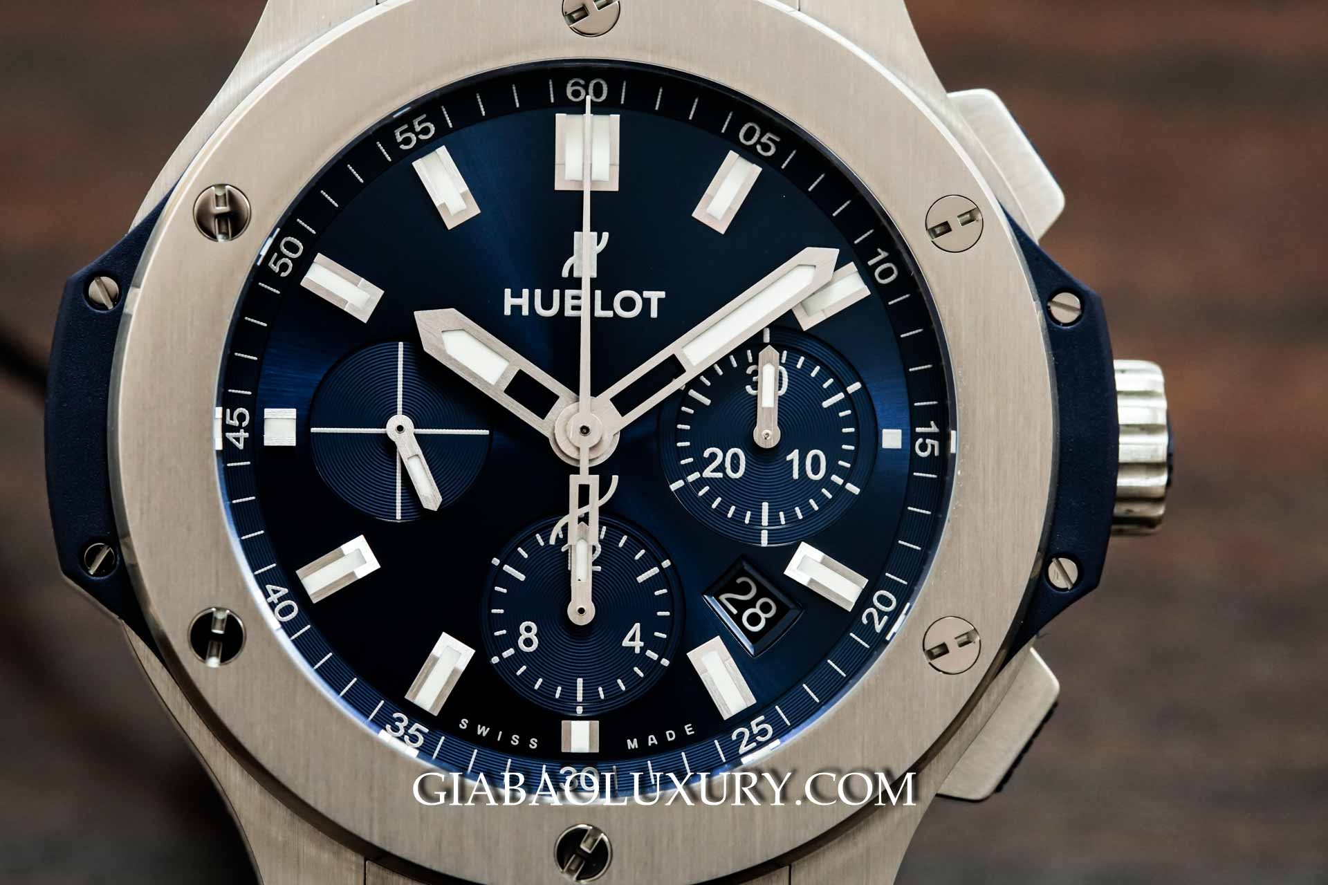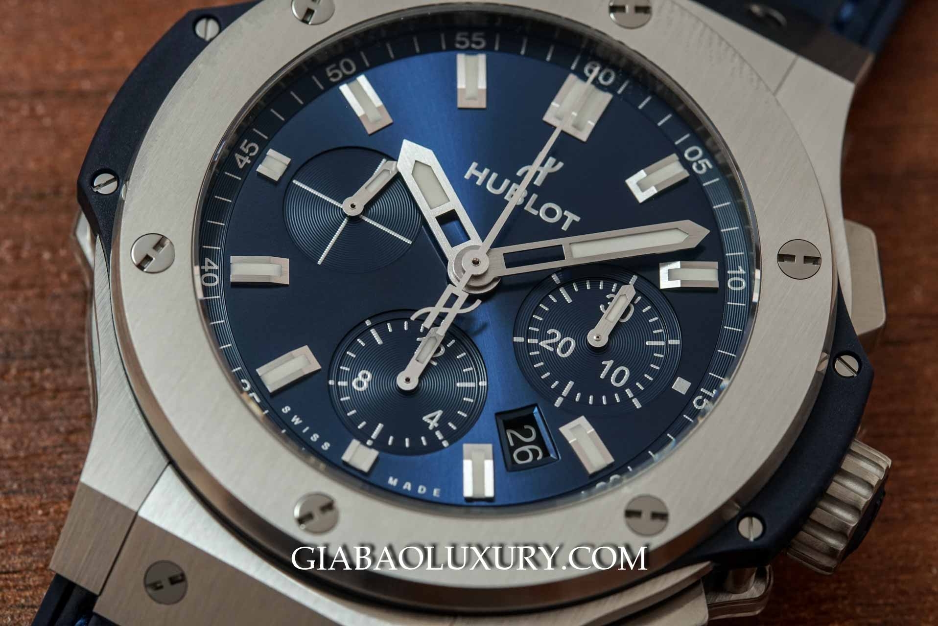 Hiện lên trên mặt số xanh của chiếc Hublot Big Bang 44mm là hệ thống 3 mặt số phụ. Trong đó, hai mặt số phụ góc 3 giờ và 6 giờ phục vụ tính năng chronograph, mặt số phụ góc 9 giờ dùng để đếm giây độc lập. Riêng kim giây chronograph có biểu tượng chữ H được tích hợp ở trung tâm cùng bộ kim dáng bút chì biểu tượng nhà Hublot, vốn được phủ chất phát quang tương tự hệ thống cọc chỉ giờ hình chữ nhật xung quanh. Ngoài cùng, sát với bộ vỏ khung của chiếc Hublot Big Bang 301.SX.7170.LR là vòng chia vạch quy mô 60 được in lên trong tông màu trắng. Ô cửa sổ báo được đặt tại góc 4h30.