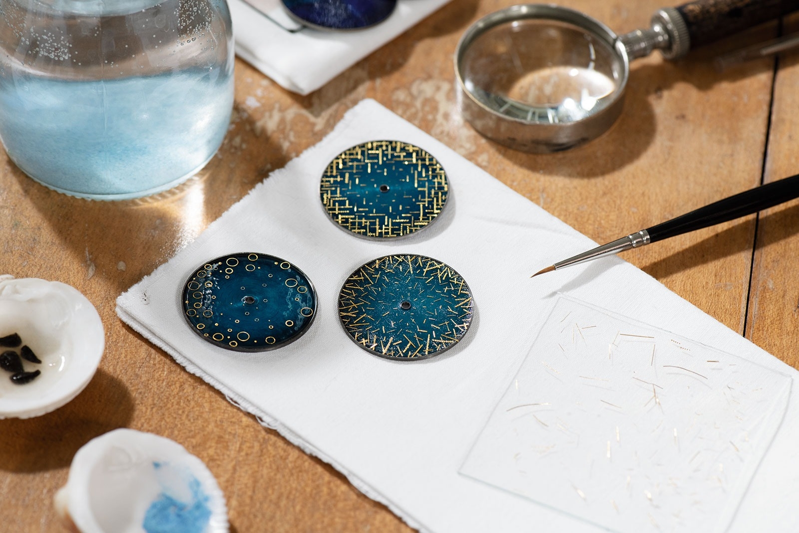 Bà Anita Porchet tự tay chuẩn bị tất cả đồ tráng men trong studio của mình. Các công đoạn thường thấy là nghiền thủy tinh màu bằng chày để thu được các hạt mịn tựa như cát, kết hợp với dung dịch lỏng, và bôi lên mặt số.