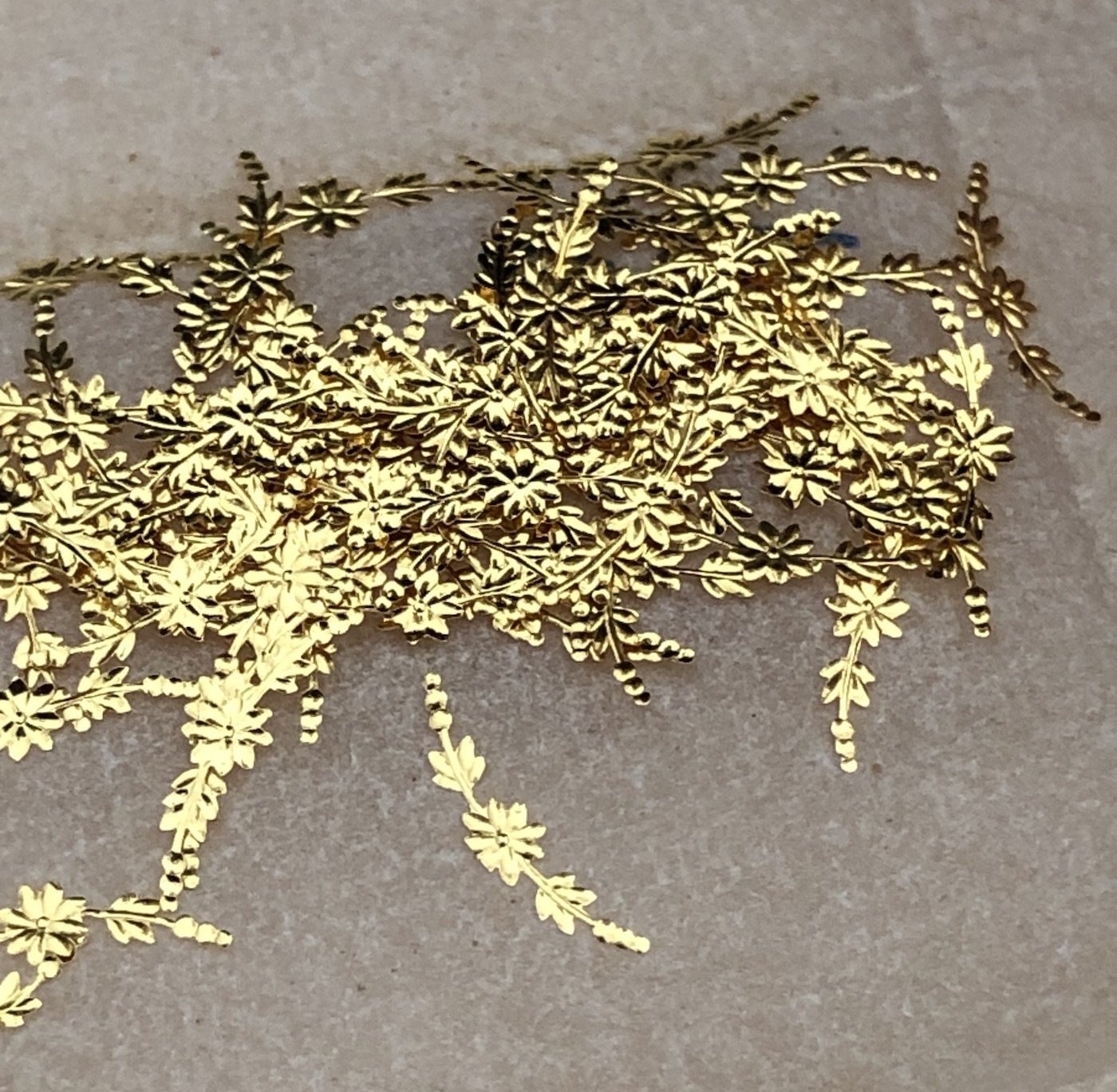Đúng là vậy. Ngay từ đầu, tôi đã bị mê hoặc bởi những mảnh trang trí nhỏ xíu được dập từ vàng lá này, ngạc nhiên trước cách tạo hình hoàn hảo của mỗi chiếc và bởi “trí thông minh thủ công” của người nghệ nhân đã thành công trong việc đạt được chất lượng như vậy mà không cần đến công cụ máy tính. Thật kỳ diệu. Gần đây tôi đã tìm được một kho hàng nghìn paillon (lá vàng) từ đầu thế kỷ 19. Rắc rối duy nhất là… tất cả chúng đều bị trộn lẫn trong cùng một lọ!