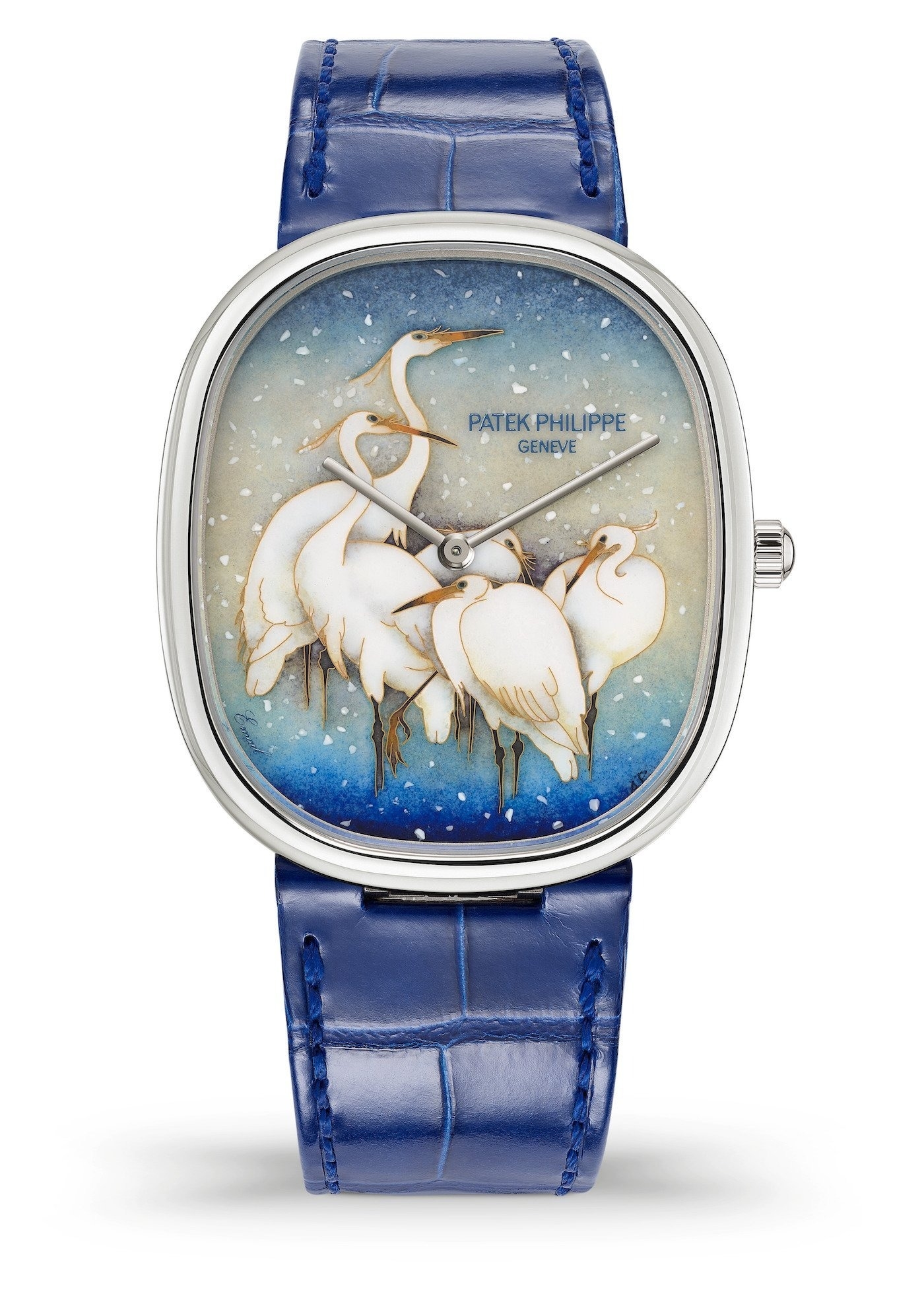 Đồng hồ đeo tay Patek Philippe Golden Ellipse White Egrets ref. 5738/50G-026 từ bộ sưu tập Rare Handcraft năm 2023, được trưng bày lần đầu tiên vào tháng 4 năm 2023 tại cửa hàng Geneva. Để diễn giải một bản in có nguồn gốc Nhật Bản những năm 1920, Anita Porchet đã sử dụng kỹ thuật cloisonné không phải để tách các màu khác nhau mà để làm nổi bật đường viền của những con diệc, nằm co ro giữa một loạt những bông tuyết đặc biệt chân thực.
