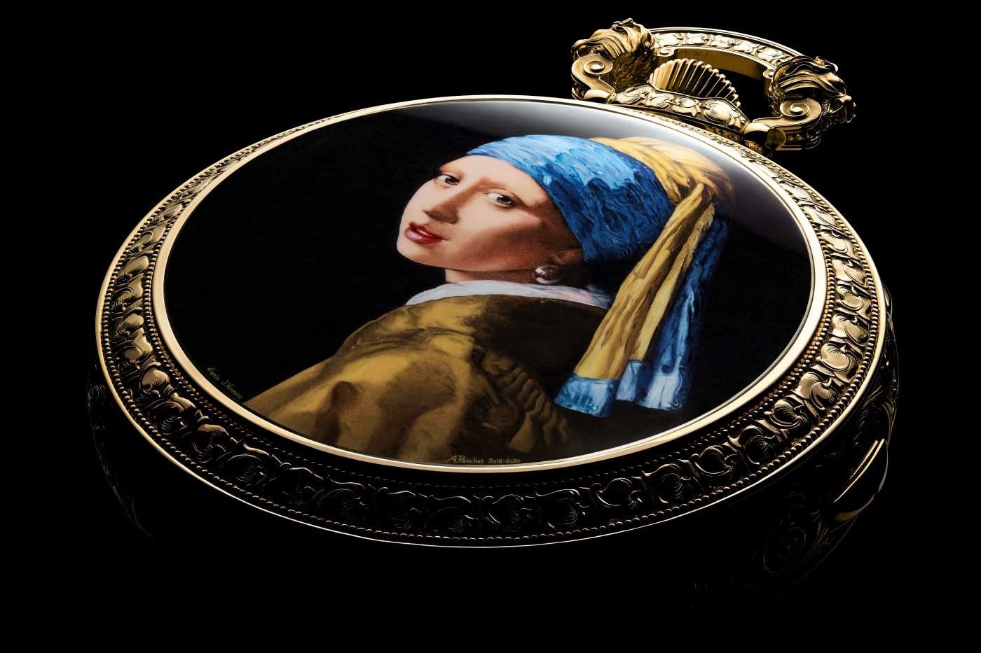 Đồng hồ bỏ túi Vacheron Constantin Les Cabinotiers Westminster Sonnerie (2021). Bức tranh thu nhỏ tráng men, có chữ ký A. Porchet 2018-2020, diễn giải bức tranh Girl With A Pearl Earring của họa sĩ người Hà Lan Johannes Vermeer (1632-1675)
