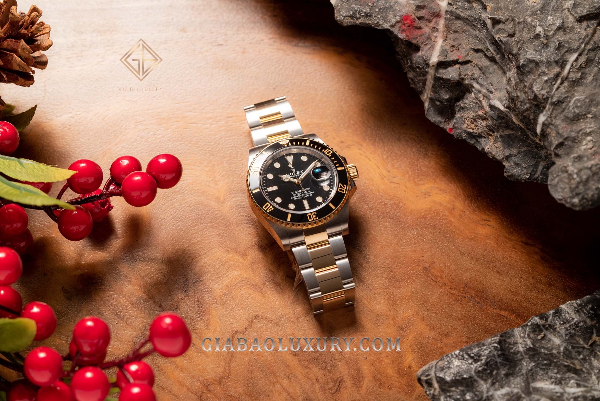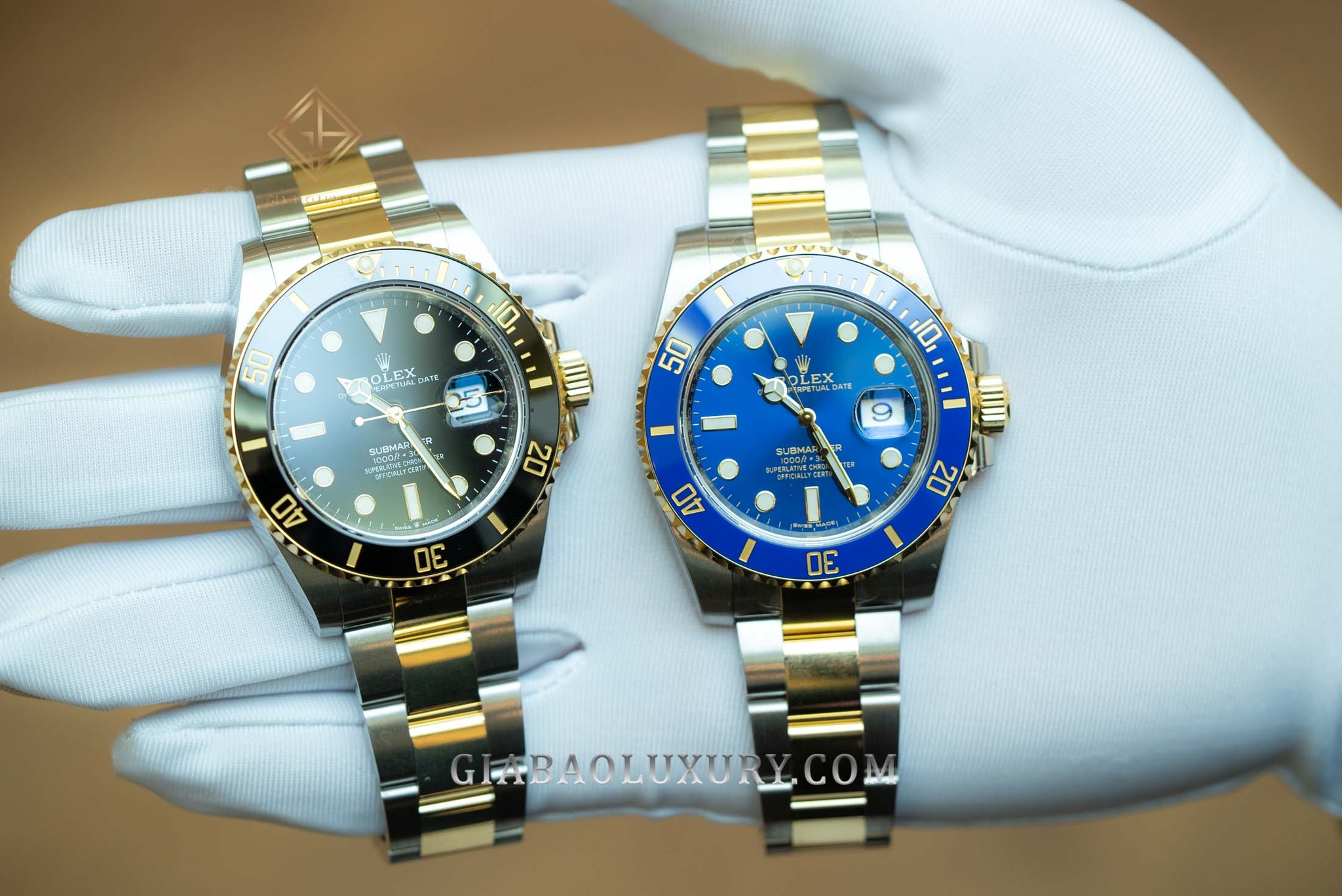 - 126619LB-0003: Submariner Date, vỏ vàng trắng, mặt số đen vành Ceramic xanh lam