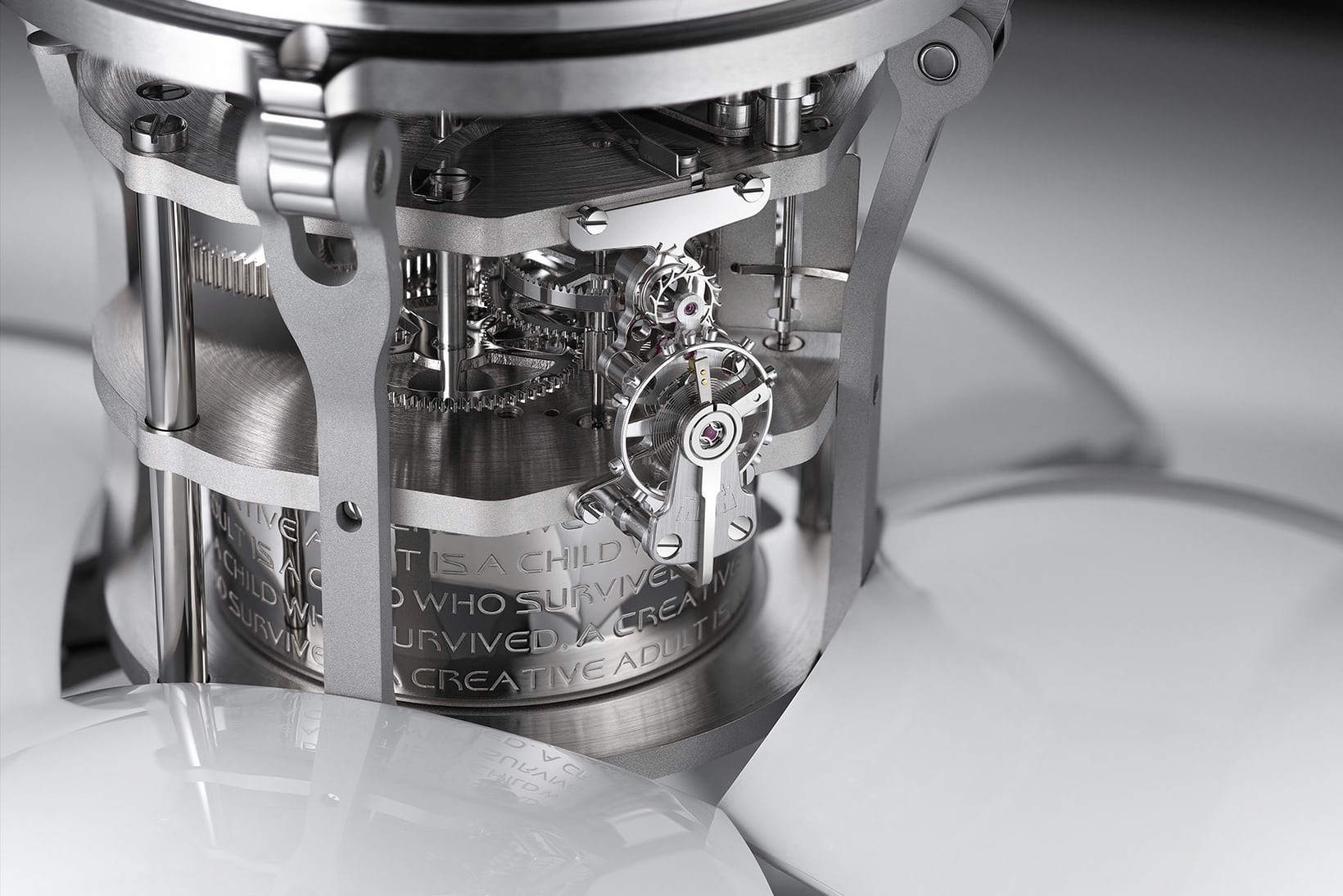Bên trong Orb, bạn sẽ tìm thấy bộ máy L'Epée được hoàn thiện tinh xảo và đẹp mắt với khả năng dự trữ năng lượng kéo dài 8 ngày. Bộ máy có hai hộp cót độc lập. Một để hiển thị thời gian, hai là để phát ra âm thanh. Với chức năng thứ hai, MB&F × L'Epée 1839 Orb có thể báo thời gian trôi qua ở những mốc cụ thể cũng như báo thời gian ngay lập tức chỉ với một nút bấm.