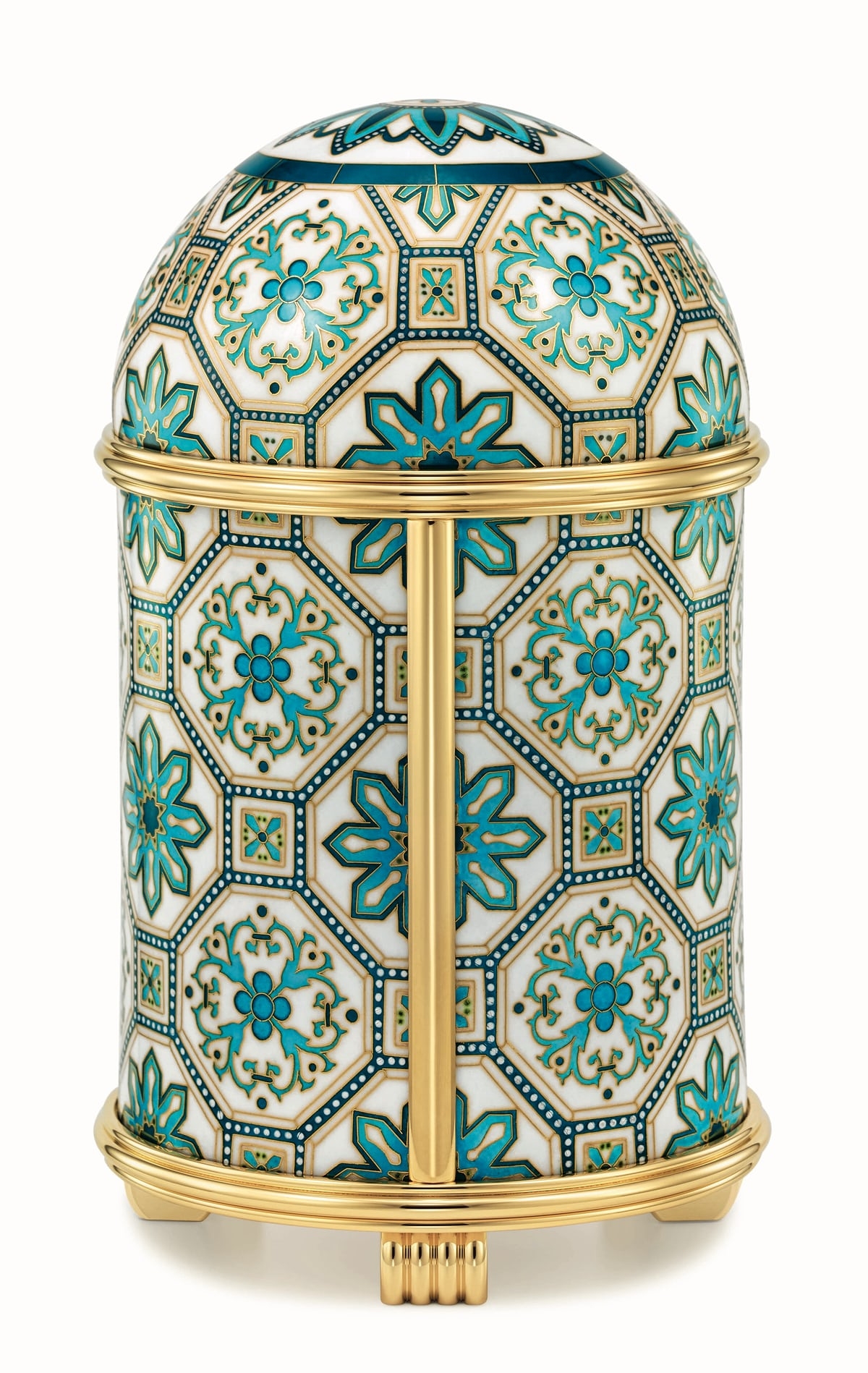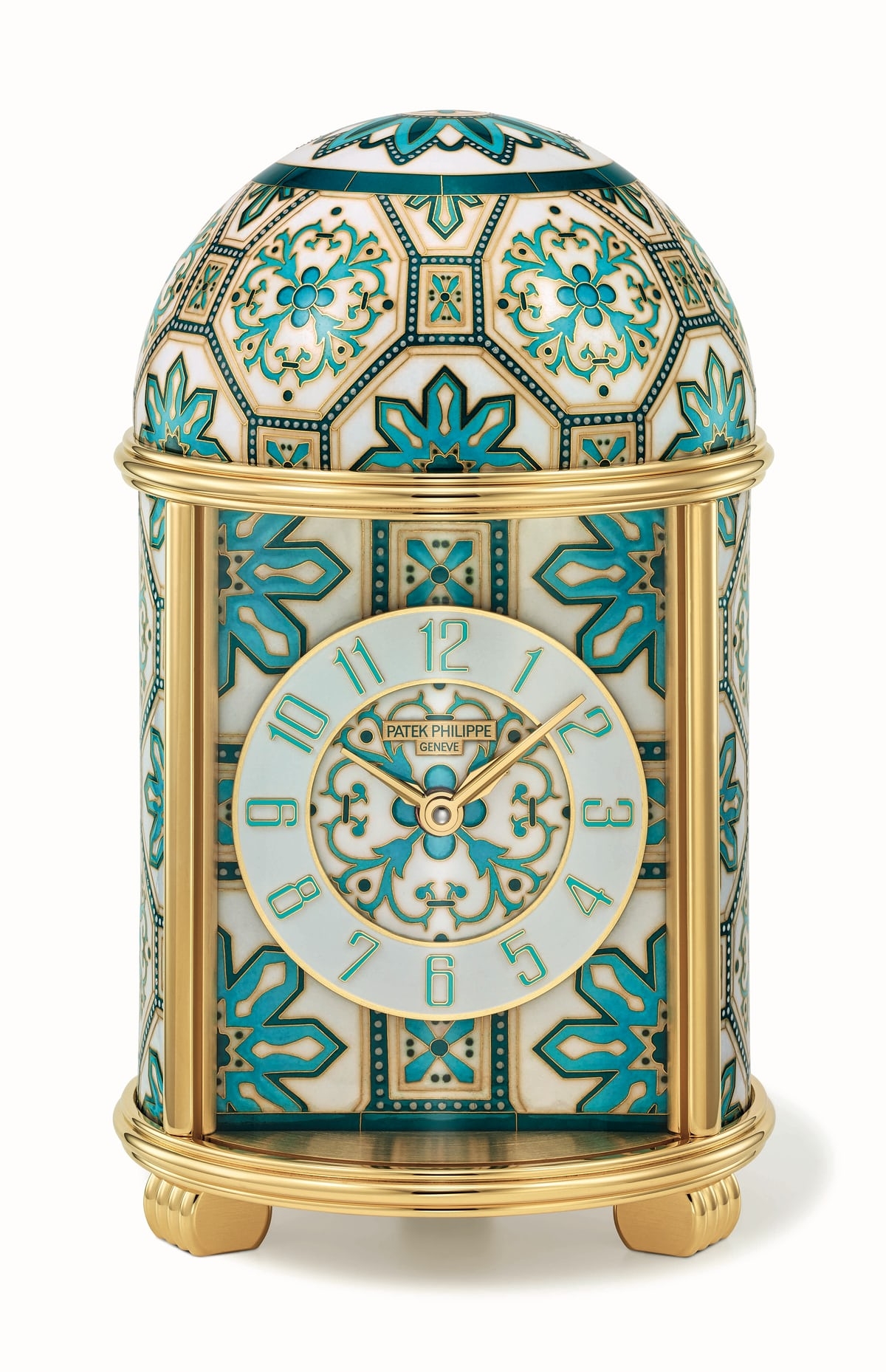 Với chiếc đồng hồ để bàn mang tên “Azulejos in Turquoise”, thương hiệu Patek Philippe sử dụng kỹ thuật tráng men cloisonné, đặc biệt khó xử lý, sai một chút là hỏng cả quá trình. Hoạ tiết đối xứng trên chiếc đồng hồ này được nhìn thấy nhiều ở Tây Ban Nha và Bồ Đào Nha.