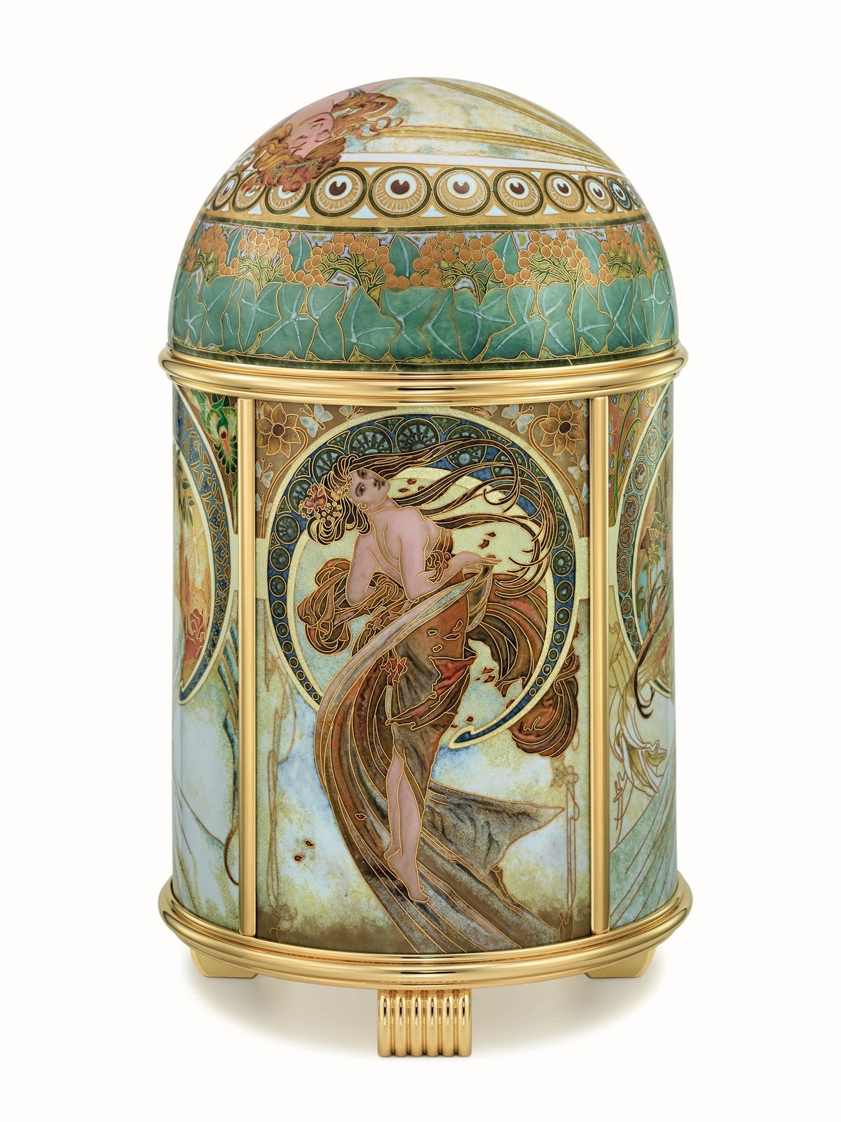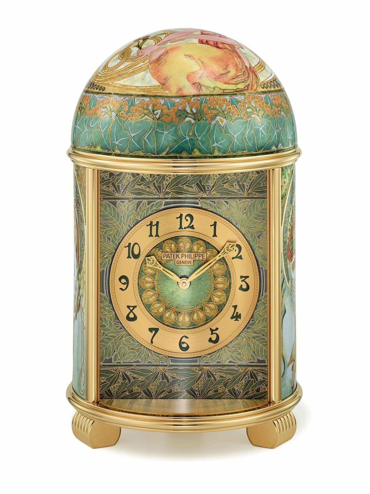 Trong khi đó, mẫu đồng hồ "Mucha, Les Arts" đã gợi lên hình thức Tân nghệ thuật, cụ thể là tôn vinh bản vẽ của người nghệ sĩ Alphonse Mucha (1860 - 1939). Cả chiếc đồng hồ là 4 câu chuyện ngụ ngôn được khắc họa đầy tính nghệ thuật của Alphonse Mucha. Để tạo ra thiết kế hoàn chỉnh của “Mucha, Les Arts", nhà sản xuất Patek Philippe cần đến 43 màu men khác nhau, theo đó, mỗi tấm men phải được nung nóng 14 lần ở nhiệt độ cỡ 745 độ C.