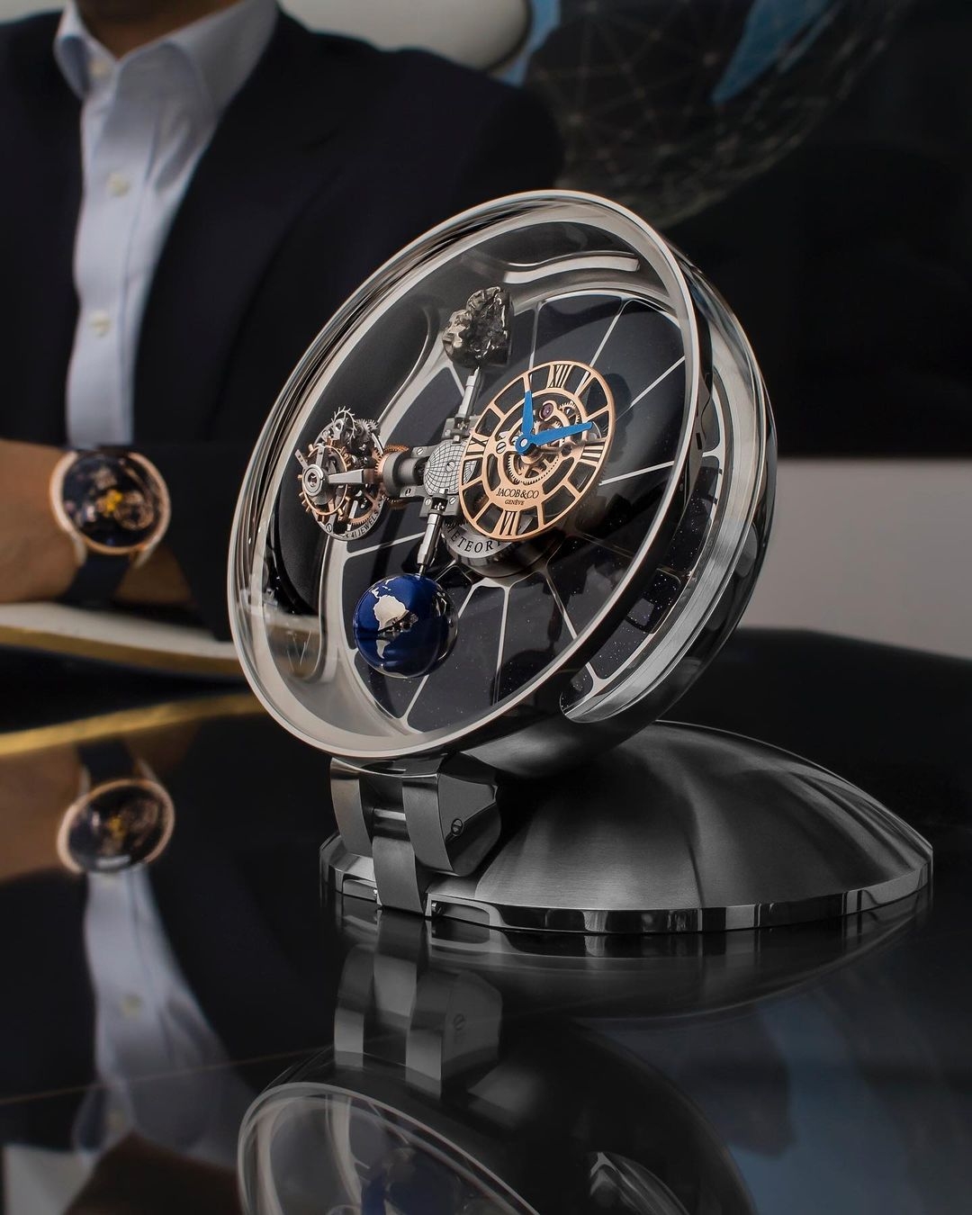 Còn ở trục còn lại là sự có mặt của một mặt trăng bằng magie phủ men xanh diễm lệ, bắt mắt. Đứng đối diện với quả cầu trái đất là miếng thiên thạch hàng độc của thương Jacob & Co. lấy từ mỏ thiên thạch Campo del Cielo, vốn được phát hiện năm 1576.