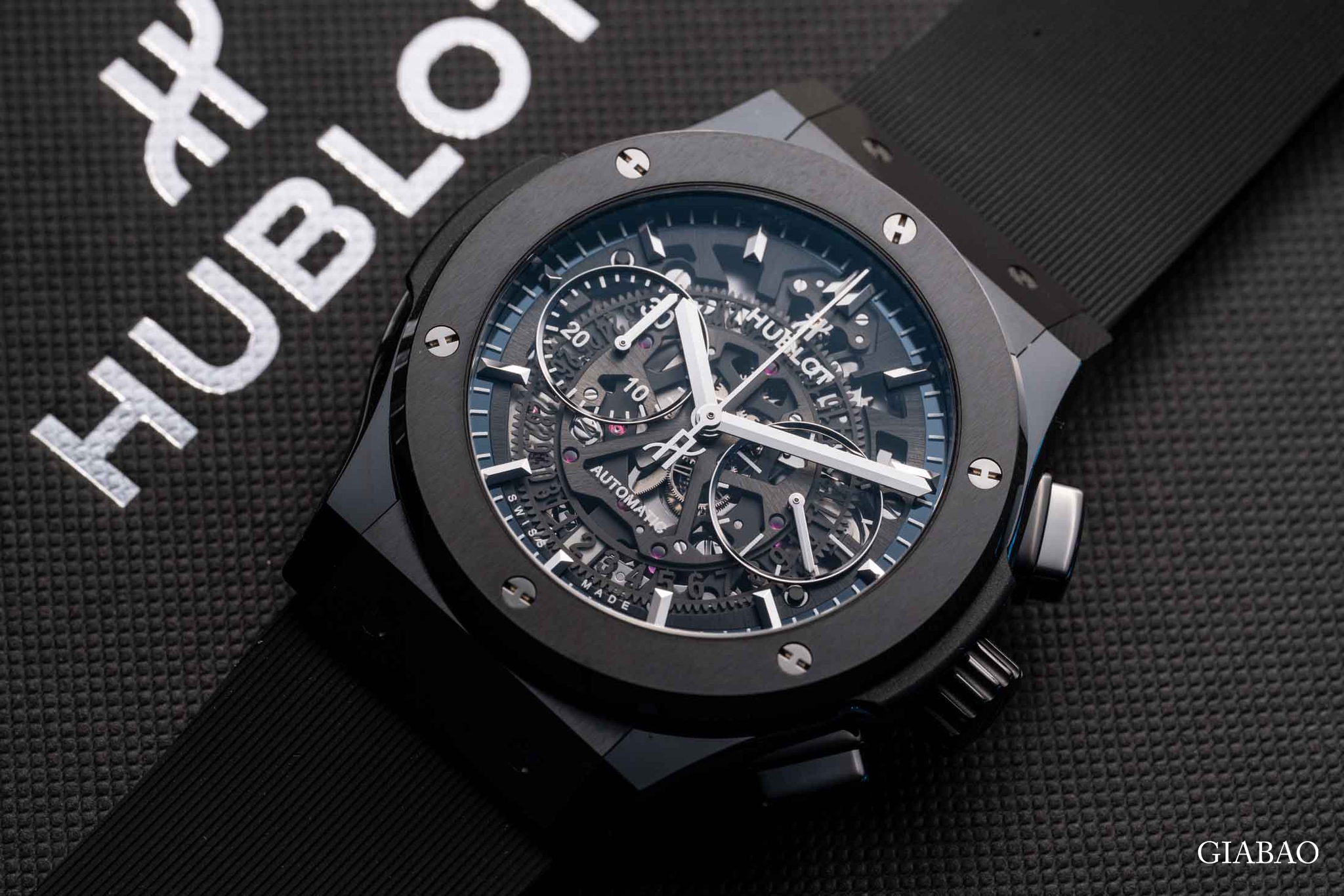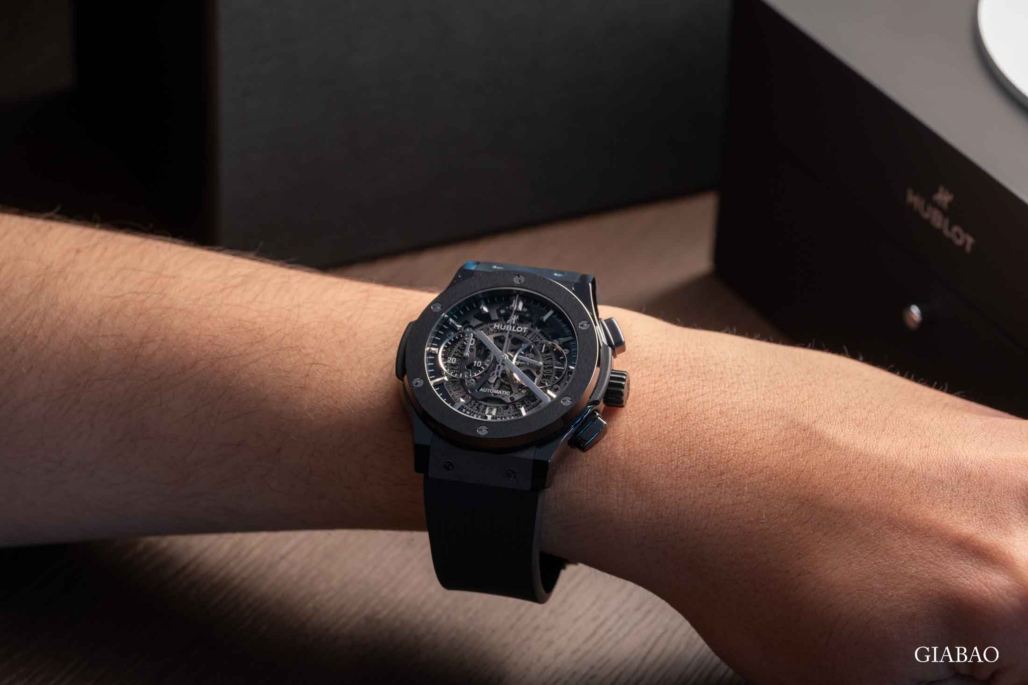 Cũng có đường kính 45mm, nhưng Hublot Classic Fusion Aerofusion phiên bản gốm ceramic đen lại toát ra cảm giác khác biệt hoàn toàn. Vỏ đồng hồ được làm từ gốm đen với các bề mặt chải xước kết hợp cùng đánh bóng, các ốc vít trong chất liệu titanium. Ở phiên bản này, dây đeo có kiểu dáng thể thao hơn, được làm toàn bộ từ cao su và có các hoạ tiết sọc chạy dọc dây đeo. Điểm gây chú ý nhất chính là mặt số, được thiết kế theo phong cách skeleton, để lộ bộ máy cơ học nhiều hơn - điều mà bất kỳ những người chơi nào cũng đều cảm thấy thích thú.