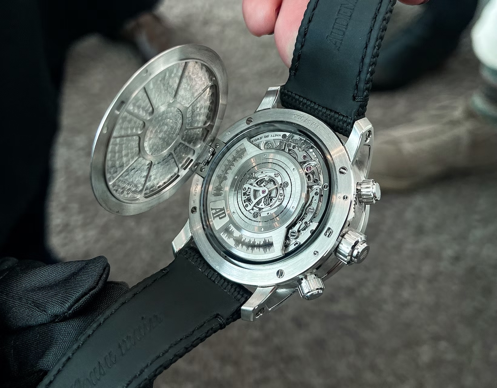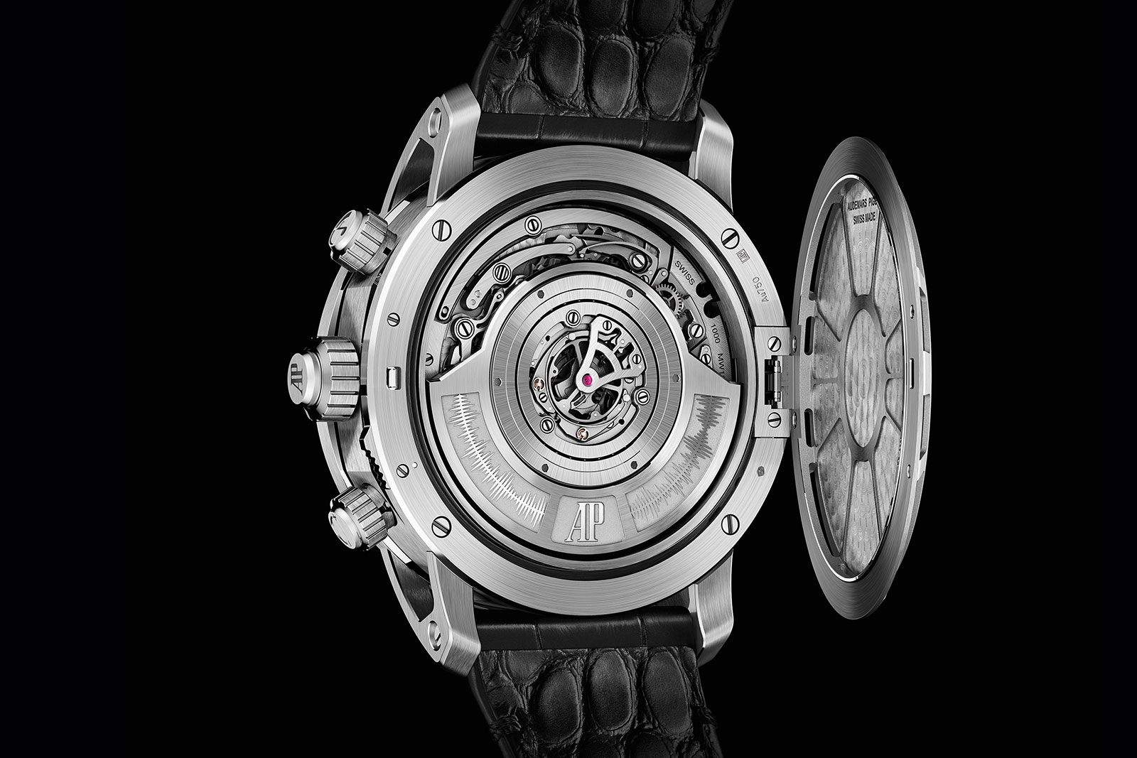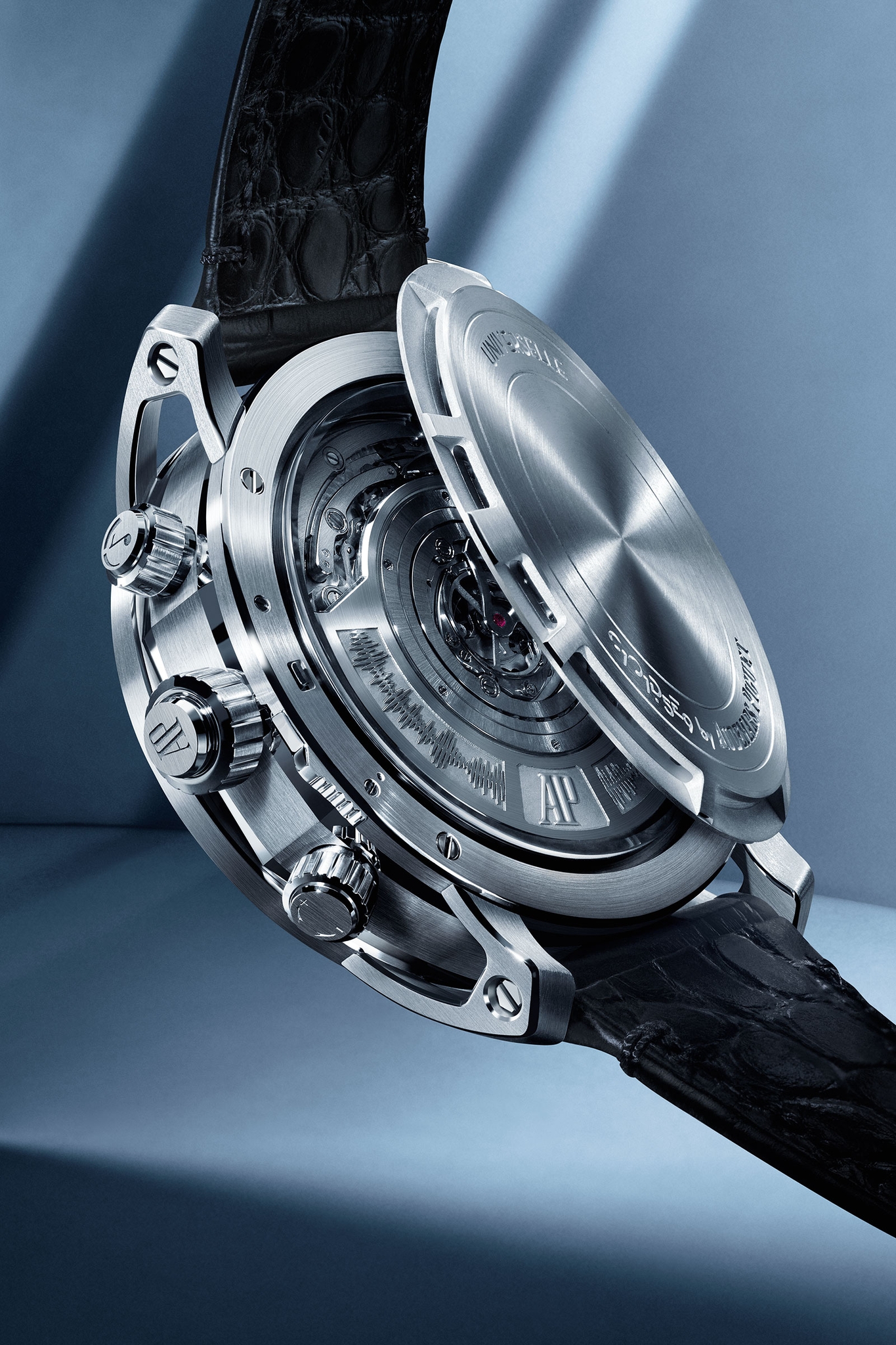 Mọi yếu tố phức tạp sẽ được nhìn thấu thông qua kính sapphire, đã được đóng nắp kín phía sau của đồng hồ. Bộ vỏ được thiết kế theo đúng thiết kế có trên chiếc Supersonnerie của AP, có tác dụng khuếch đại tiếng chuông. Ở chiếc Supersonnerie thông thường, mặt sau bên ngoài được cố định; còn trong Code 11.59 Universelle có thêm một bản lề, nhưng về cơ bản hiệu quả là tương đương.