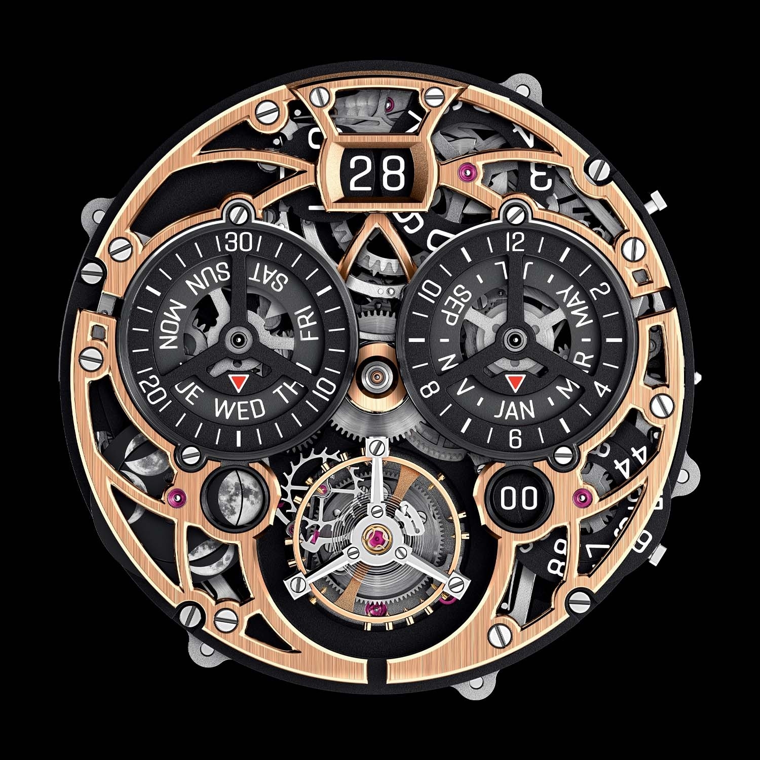 Nằm bên trong đồng hồ là một trong những sản phẩm của bộ phận Research and Development, chuyên nghiên cứu và phát triển những bộ máy với công nghệ tiên tiến, luôn giải quyết các vấn đề mới. CODE 11.59 Universelle là sự tổng hợp của tất cả các cơ chế đồng hồ truyền thống, tạo nên một yếu tố đặc biệt phức tạp. Chúng ta có thể tìm thấy: lịch vạn niên, rattrapante với flyback chronograph, tourbillon và grande et petite sonnerie với bộ điểm chuông.
