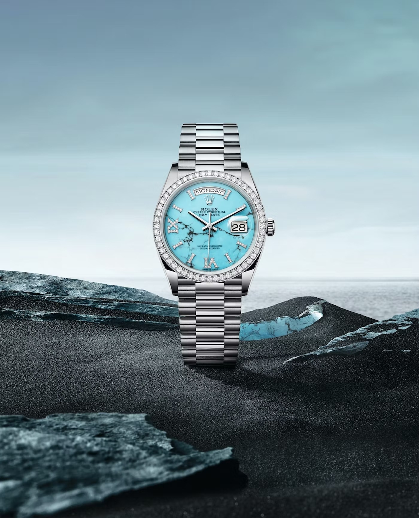 Ba phiên bản Day-Date còn lại xuất hiện với mặt số làm từ đá quý như carnelian (vàng vàng), ngọc lam (bạch kim) và aventurine xanh lục (vàng Everose), bắt nguồn từ những năm 1970. Mặt số bằng đá có các cọc chỉ giờ khảm kim cương hoặc đá quý.