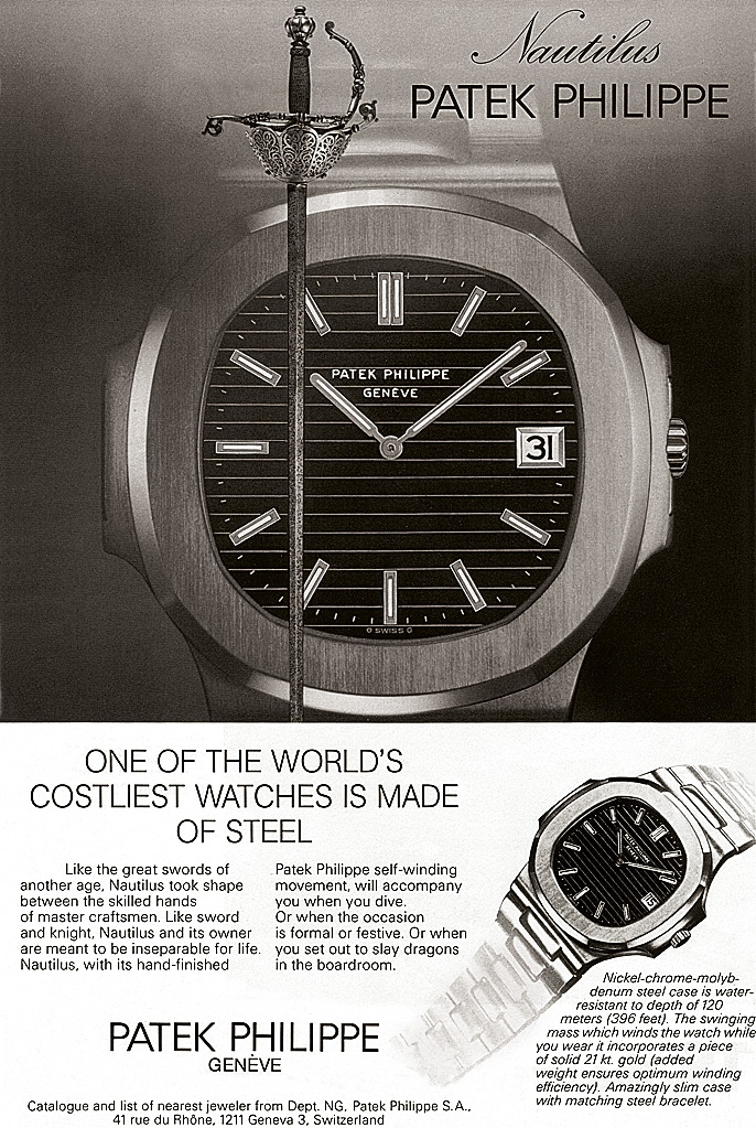 Nautilus của Patek Philippe mang chủ đề hàng hải và các chi tiết được hợp lý hoá hơn nhiều. Vỏ có cấu trúc khác thường với hai “tai" vươn sang hai bên, khác biệt với mọi mẫu đồng hồ cùng loại. Khác với Royal Oak đinh vít lộ trên vành bezel, với Nautilus, không khó để nhìn thấy các đinh vít ở mặt bên của dây đeo. 46 năm kể từ khi ra mắt vào năm 1976, Nautilus vẫn là một trong những mẫu đồng hồ được tìm kiếm nhiều nhất trong ngành công nghiệp chế tạo.