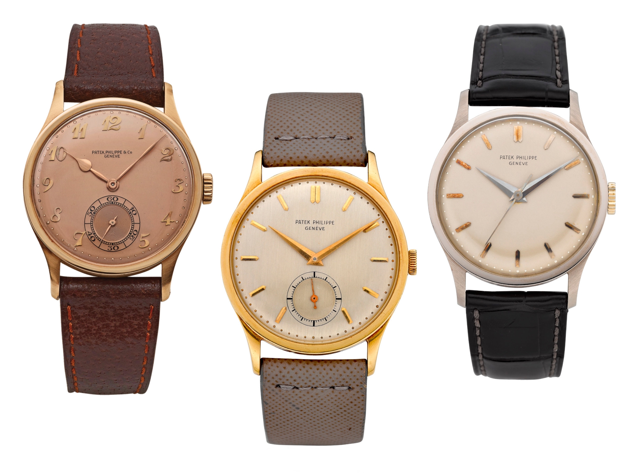 Patek Philippe Calatrava 570. Từ trái sang phải: Phiên bản vàng hồng, mặt số hồng, cọc số Breguet, sản xuất khoảng năm 1940; Phiên bản chính giữa vàng vàng sản xuất khoảng năm 1954; Phiên bản vàng trắng mặt số bạc sản xuất khoảng năm 1962