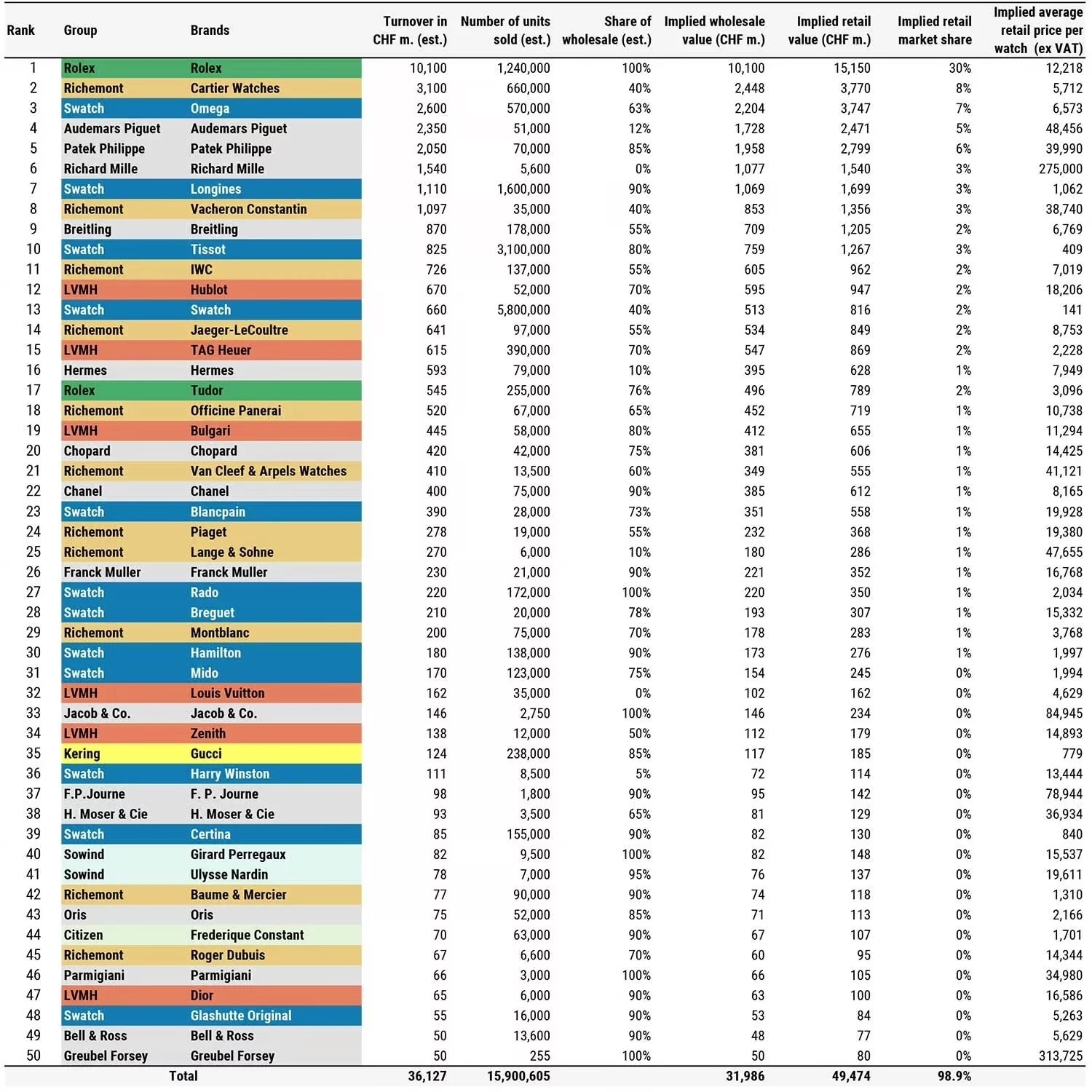 Vacheron Constantin là một trong hai thương hiệu duy nhất do tập đoàn Richemont nắm giữ nằm trong top 10. Hãng này sản xuất ít (35.000 chiếc) đồng hồ hơn nhiều so với Audemars Piguet và Patek Philippe (51.000 và 71.000 chiếc).