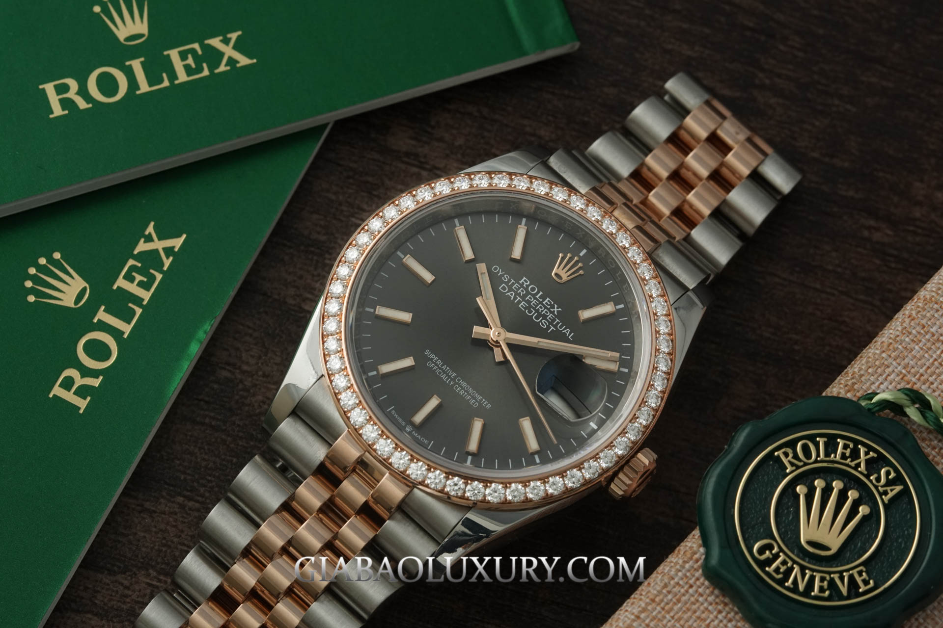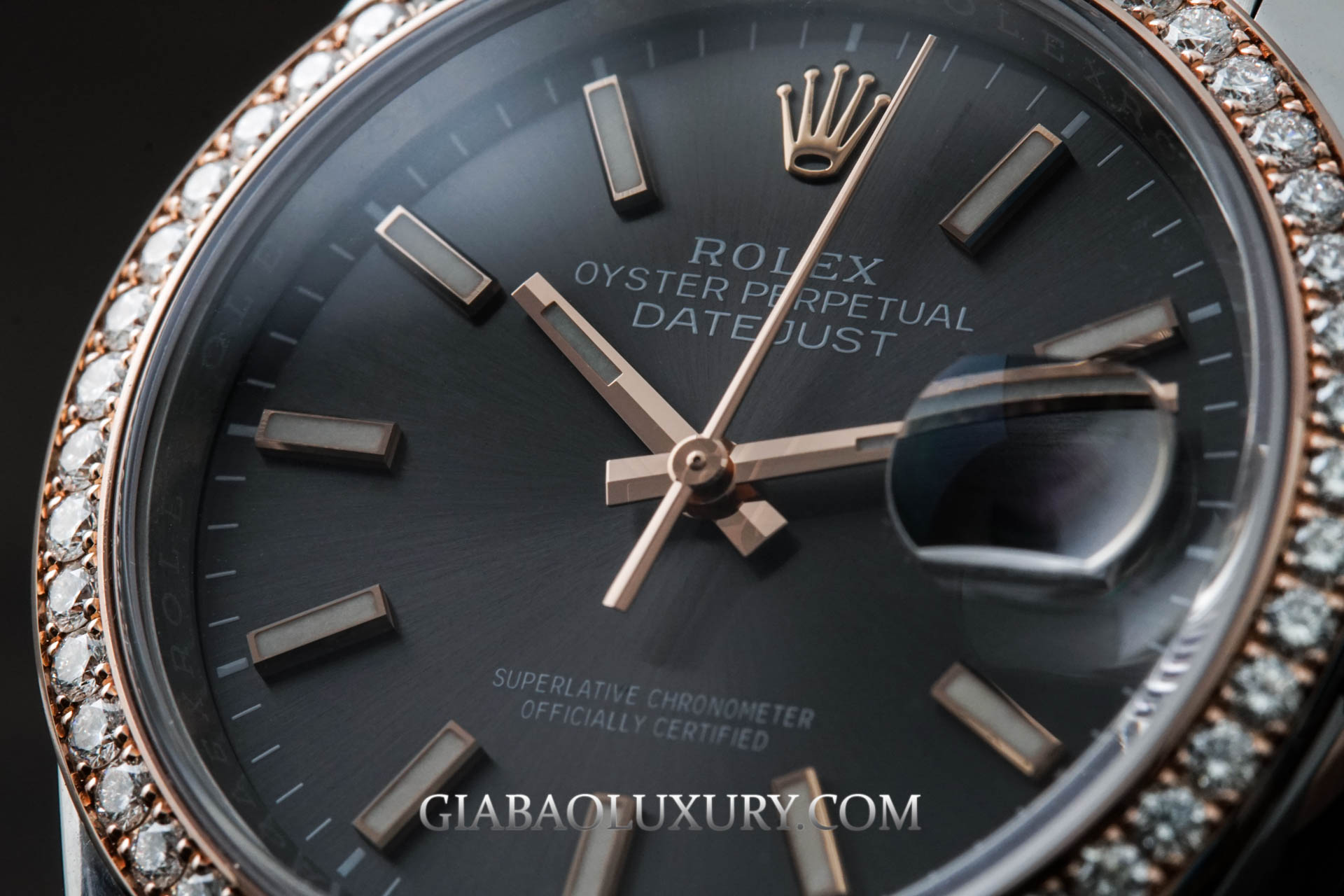 Mẫu đồng hồ thứ hai đến từ thương hiệu Rolex, ông hoàng đồng hồ, thương hiệu nổi tiếng nhất thế giới. Bộ sưu tập Datejust đã trở thành biểu tượng của thương hiệu này, và tất cả những thiết kế trong đó đều đạt tỉ lệ chuẩn mực trong thiết kế. Với mẫu 126281RBR, chúng ta có một mặt số khá đơn giản với cọc số phát quang, nhưng đi kèm với bộ vành kim cương nguyên bản tuyệt đẹp.