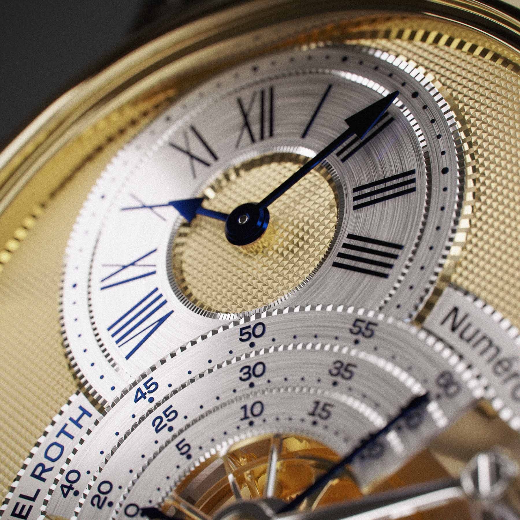 Giống như bản gốc, lồng tourbillon hiện diện ở góc 6 giờ trên mặt số, kèm với kim giây chia làm 3 nhánh có độ dài ứng với ba vòng cung đếm giây. Mặc dù lồng tourbillon phần lớn giữ lại thẩm mỹ như trên bản gốc, nhưng vẫn có điểm khác biệt. Rõ ràng nhất là lồng tourbillon trên cùng nằm trên mặt phẳng với thang đo báo giây.