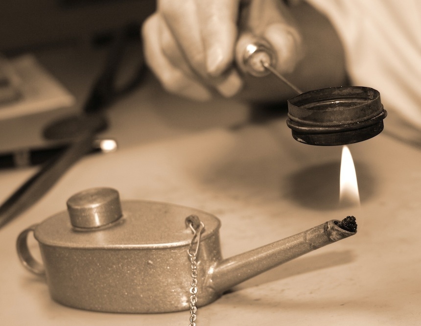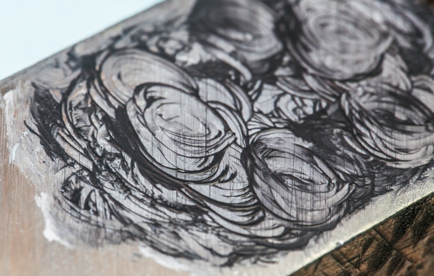 Hình ảnh bên trên đang mô tả hành động mà người thợ trẻ tuổi đưa một cái gì đó rất nhỏ qua lại bề mặt miếng thiếc. Tấm thiếc có bề mặt cũ kỹ này (có phủ một lớp kim cương mỏng lên trên) là lớp nền lý tưởng để đánh bóng đen các đầu vít. Từng chiếc vít nhỏ sẽ được di chuyển qua lại bề mặt của miếng thiếc. Có thể bắt gặp trên hầu hết bàn làm việc của mọi thợ đồng hồ là những chiếc đĩa nhỏ có chứa chất dẻo màu xanh lam. Chất dẻo này là vùng an toàn chứa đựng những vít hoàn thiện. Và tại Lang & Heyne, từng chiếc vít đều được hoàn thiện cẩn thận.