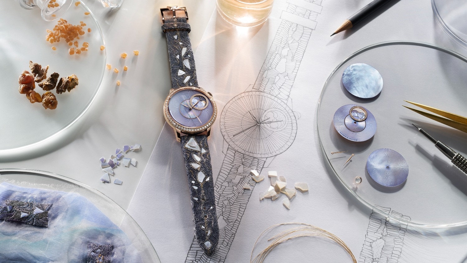 Được chế tạo với sự cộng tác của tài năng “One of Not Many” Yiqing Yin, chiếc đồng hồ Egerie Concept kết hợp tinh hoa của giới chế tạo đồng hồ cao cấp, nước hoa và thời trang cao cấp. Được trang trí bằng 92 viên kim cương, chiếc đồng hồ tuyệt đẹp như Egerie Concept sở hữu bộ vỏ bằng vàng hồng, điều đã làm nổi bật lên mặt số xà cừ ánh tím bên trong. Thậm chí, nhà sản xuất còn khiến mặt số hấp dẫn hơn khi cố gắng tạo ra những nếp gấp guilloche trên bề mặt xà cừ tím.